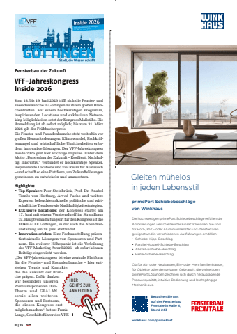 VFF-Jahreskongress Inside 2026Vom 18. bis 19. Juni 2026 trifft sich die Fenster- und Fassadenbranche in G%u00f6ttingen zu ihrem gro%u00dfen Branchentreffen. Mit einem hochkar%u00e4tigen Programm, inspirierenden Locations und exklusiven Networking-M%u00f6glichkeiten setzt der Kongress Ma%u00dfst%u00e4be. Die Anmeldung ist ab sofort m%u00f6glich; bis zum 31. M%u00e4rz 2026 gilt der Fr%u00fchbucherpreis.Die Fenster- und Fassadenbranche steht weiterhin vor gro%u00dfen Herausforderungen: Klimawandel, Fachkr%u00e4ftemangel und wirtschaftliche Unsicherheiten erfordern innovative L%u00f6sungen. Der VFF-Jahreskongress Inside 2026 gibt hier wichtige Impulse. Unter dem Motto %u201eFensterbau der Zukunft %u2013 Resilient. Nachhaltig. Innovativ.%u201c verbindet er hochkar%u00e4tige Speaker, inspirierende Locations und viel Raum f%u00fcr Austausch %u2013 und schafft so eine Plattform, um Zukunftsl%u00f6sungen gemeinsam zu entwickeln und umzusetzen.Highlights:%u2022 Top-Speaker: Peer Steinbr%u00fcck, Prof. Dr. Anabel Tern%u00e8s von Hattburg, Arved Fuchs und weitere Experten beleuchten aktuelle politische und wirtschaftliche Trends sowie Nachhaltigkeitsstrategien.%u2022 Exklusive Locations: der Kongress startet am 17. Juni mit einem Vorabendtreff im Strandhaus 37. Hauptveranstaltungsort f%u00fcr den Kongress ist die LOKHALLE G%u00f6ttingen, in der auch die Abendveranstaltung am 18. Juni stattfindet.%u2022 Innovation erleben: Eine Fachausstellung pr%u00e4sentiert aktuelle L%u00f6sungen von Sponsoren und Partnern. Ein weiterer H%u00f6hepunkt ist die Verleihung des VFF-Marketing Award 2026 %u2013 ab sofort k%u00f6nnen Beitr%u00e4ge eingereicht werden.%u201eDer VFF-Jahreskongress ist eine zentrale Plattform f%u00fcr die Fenster- und Fassadenbranche %u2013 hier entstehen Trends und Kontakte, die die Zukunft der Branche pr%u00e4gen. Daf%u00fcr danken wir besonders unseren Premiumsponsoren DuoTherm und GEALAN sowie allen weiteren Sponsoren und Partnern, die diesen Kongress erst m%u00f6glich machen%u201c, betont Frank Lange, Gesch%u00e4ftsf%u00fchrer des VFF. yFensterbau der Zukunft winkhaus.com/primePortDie hochwertigen primePort Schiebebeschl%u00e4ge erf%u00fcllen die Anforderungen verschiedenster Einsatzszenarien. Sie sind f%u00fcr Holz-, PVC- oder Aluminiumfenster und -fenstert%u00fcren geeignet und in verschiedenen Ausf%u00fchrungen erh%u00e4ltlich: %u2022 Schiebe-Kipp-Beschlag%u2022 Parallel-Abstell-Schiebe-Beschlag%u2022 Abstell-Schiebe-Beschlag%u2022 Hebe-Schiebe-BeschlagOb f%u00fcr Alt- oder Neubauten, Ein- oder Mehrfamilienh%u00e4user, f%u00fcr Objekte oder den privaten Gebrauch, die vielseitigen primePort L%u00f6sungen zeichnen sich durch herausragende Produktqualit%u00e4t, intuitive Bedienung und leichtg%u00e4ngige Mechanik aus.primePort Schiebebeschl%u00e4ge von Winkhaus Gleiten m%u00fchelosin jeden LebensstilBesuchen Sie uns auf der Fensterbau Frontale in Halle 4, Stand 243HIER GEHT%u2018S ZUR ANMELDUNG01| 26