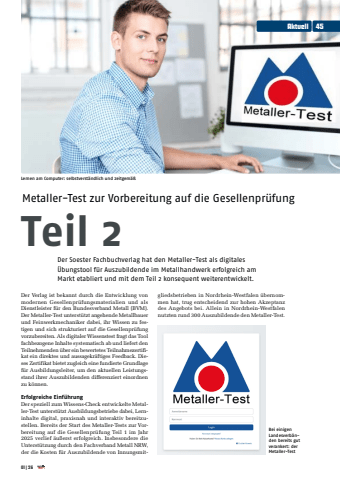 Metaller-Test zur Vorbereitung auf die Gesellenpr%u00fcfungTeil 2 Der Soester Fachbuchverlag hat den Metaller-Test als digitales %u00dcbungstool f%u00fcr Auszubildende im Metallhandwerk erfolgreich am Markt etabliert und mit dem Teil 2 konsequent weiterentwickelt.Der Verlag ist bekannt durch die Entwicklung von modernen Gesellenpr%u00fcfungsmaterialien und als Dienstleister f%u00fcr den Bundesverband Metall (BVM). Der Metaller-Test unterst%u00fctzt angehende Metallbauer und Feinwerkmechaniker dabei, ihr Wissen zu festigen und sich strukturiert auf die Gesellenpr%u00fcfung vorzubereiten. Als digitaler Wissenstest fragt das Tool fachbezogene Inhalte systematisch ab und liefert den Teilnehmenden %u00fcber ein bewertetes Teilnahmezertifikat ein direktes und aussagekr%u00e4ftiges Feedback. Dieses Zertifikat bietet zugleich eine fundierte Grundlage f%u00fcr Ausbildungsleiter, um den aktuellen Leistungsstand ihrer Auszubildenden differenziert einordnen zu k%u00f6nnen.Erfolgreiche Einf%u00fchrungDer speziell zum Wissens-Check entwickelte Metaller-Test unterst%u00fctzt Ausbildungsbetriebe dabei, Lerninhalte digital, praxisnah und interaktiv bereitzustellen. Bereits der Start des Metaller-Tests zur Vorbereitung auf die Gesellenpr%u00fcfung Teil 1 im Jahr 2025 verlief %u00e4u%u00dferst erfolgreich. Insbesondere die Unterst%u00fctzung durch den Fachverband Metall NRW, der die Kosten f%u00fcr Auszubildende von Innungsmitgliedsbetrieben in Nordrhein-Westfalen %u00fcbernommen hat, trug entscheidend zur hohen Akzeptanz des Angebots bei. Allein in Nordrhein-Westfalen nutzten rund 300 Auszubildende den Metaller-Test. Bei einigen Landesverb%u00e4nden bereits gut verankert: der Metaller-TestLernen am Computer: selbstverst%u00e4ndlich und zeitgem%u00e4%u00dfAktuell 4501| 26