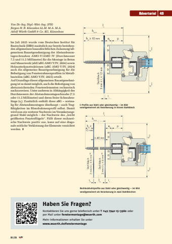 Von Dr.-Ing. Dipl.-Wirt.-Ing. (FH) J%u00fcrgen H. R. K%u00fcenzlen LL.M. M.A. M.A. Adolf W%u00fcrth GmbH & Co. KG, K%u00fcnzelsau Im Juli 2025 wurde vom Deutschen Institut f%u00fcr Bautechnik (DIBt) zus%u00e4tzlich zur bereits bestehenden allgemeinen bauaufsichtlichen Zulassung/allgemeinen Bauartgenehmigung der Abstandsmontageschrauben AMO-Y/AMO IV (Durchmesser 7,5 und 11,5 Millimeter) f%u00fcr die Montage in Beton und Mauerwerk (abZ/aBG AMO Y/IV, 2024) sowie Holzunterkonstruktionen (aBG AMO Y/IV, 2024) auch die allgemeine Bauartgenehmigung f%u00fcr die Befestigung von Fensterrahmenprofilen in Metallbauteilen (aBG AMO Y/IV, 2025) erteilt.Auf Grundlage dieser allgemeinen Bauartgenehmigung ist es damit m%u00f6glich, auch die Befestigung von absturzsichernden Fensterelementen rechnerisch nachzuweisen. Unter anderem in Abh%u00e4ngigkeit des Durchmessers der Abstandsmontageschraube (7,5 oder 11,5 Millimeter) und deren freier Schraubenl%u00e4nge (ef). Zus%u00e4tzlich enth%u00e4lt diese aBG %u2013 erstmalig f%u00fcr Abstandsmontagen %u00fcberhaupt %u2013 auch Tragf%u00e4higkeiten im Blendrahmenprofil selbst. Damit wird nun ein weiterer Nachweis im Verankerungsgrund Stahl m%u00f6glich %u2013 der Nachweis des %u201eleicht ge%u00f6ffneten Fensterfl%u00fcgels%u201c. F%u00e4llt dieser rechnerische Nachweis positiv aus, kann auf eine diagonale seitliche Verklotzung der Elemente verzichtet werden. yC-Profile aus Stahl oder gleichwertig %u2013 im Bild verallgemeinert als Verankerung in einem StahlblechRechteckhohlprofile aus Stahl oder gleichwertig %u2013 im Bildverallgemeinert als Verankerung in zwei Stahlblechen01| 26Advertorial 49Haben Sie Fragen?Kontaktieren Sie uns gerne telefonisch unter T +49 7940 15-3960 oder per Mail unter fenstermontage@wuerth.comMehr Informationen erhalten Sie unterwww.wuerth.de/fenstermontage
