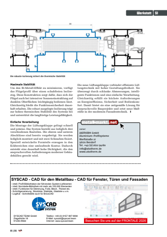 KONTAKTAKOTHERM GmbHAluminium-ProfilsystemeWerftstra%u00dfe 2756170 BendorfTel. +49 (0) 2622 94180info@akotherm.dewww.akotherm.deMaximale Stabilit%u00e4tUm den Bi-Metall-Effekt zu minimieren, verf%u00fcgt das Fl%u00fcgelprofil %u00fcber einen schubfreien Isoliersteg. Diese Konstruktion sorgt daf%u00fcr, dass sich der Fl%u00fcgel auch bei intensiver Sonneneinstrahlung auf dunklen Oberfl%u00e4chen leichtg%u00e4ngig bedienen l%u00e4sst. Gleichzeitig bleibt die Funktionssicherheit dauerhaft erhalten. Die robust ausgelegte Isolierung tr%u00e4gt zur hohen thermischen Stabilit%u00e4t des Systems bei und unterst%u00fctzt die langfristige Leistungsf%u00e4higkeit.Einfache VerarbeitungDie Montage der L%u00fcftungsklappe gelingt schnell und pr%u00e4zise. Das System besteht aus lediglich drei verschiedenen Bauteilen. Die oberen und unteren Abschl%u00fcsse sind bereits vorgefertigt. Sie werden lediglich montiert und mit zwei Schrauben fixiert. Speziell entwickelte Formteile erzeugen in den Eckbereichen eine umlaufende Kontur. Dadurch entsteht eine dauerhaft hohe Dichtigkeit, die den anspruchsvollen Anforderungen moderner Geb%u00e4udeh%u00fcllen gerecht wird.Die neue L%u00fcftungsklappe verbindet effiziente L%u00fcftungstechnik mit hoher Gestaltungsfreiheit. Sie %u00fcberzeugt durch schlanke Abmessungen, intelligente Funktionen und eine einfache Verarbeitung. Gleichzeitig erf%u00fcllt sie h%u00f6chste Anforderungen an Energieeffizienz, Sicherheit und Bedienkomfort. Damit bietet sie eine zeitgem%u00e4%u00dfe L%u00f6sung f%u00fcr anspruchsvolle Bauprojekte und setzt neue Ma%u00dfst%u00e4be in der modernen Fassadentechnik. yDie robuste Isolierung sichert die thermische Stabilit%u00e4tBesuchen Sie uns auf der FRONTALE 2026SYSCAD TEAM GmbHZiegelh%u00fctte 1891236 AlfeldTelefon: +49 (0) 9157 997 9994E-Mail: syscad@syscad.teamInternet: www.syscad.teamSYSCAD - CAD f%u00fcr den Metallbau - CAD f%u00fcr%u2005Fenster, T%u00fcren und Fassaden- intell. Profil-Bibliotheken der f%u00fchrenden System-Lieferanten - intell. Normteile-Bibliothek mit mehr als 100.000 Elementen- intell. Funktionen f%u00fcr D%u00e4mmung, Folie, Blech, Paneel etc.- Schnittgenerierung, St%u00fcckliste, Stabliste, Glasliste u.v.m.- LogiKal - Schnittstelle auch f%u00fcr BricsCADWerkstatt 5101 |26
