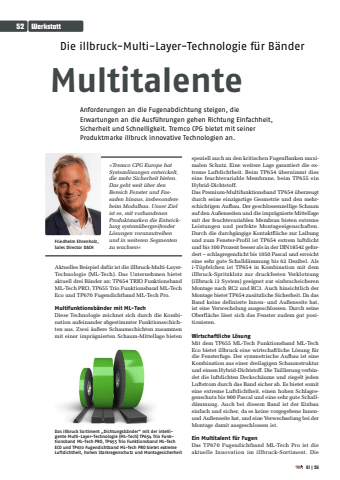 Die illbruck-Multi-Layer-Technologie f%u00fcr B%u00e4nderMultitalenteAnforderungen an die Fugenabdichtung steigen, die Erwartungen an die Ausf%u00fchrungen gehen Richtung Einfachheit, Sicherheit und Schnelligkeit. Tremco CPG bietet mit seiner Produktmarke illbruck innovative Technologien an.Aktuelles Beispiel daf%u00fcr ist die illbruck-Multi-LayerTechnologie (ML-Tech). Das Unternehmen bietet aktuell drei B%u00e4nder an: TP654 TRIO Funktionsband ML-Tech PRO, TP655 Trio Funktionsband ML-Tech Eco und TP670 Fugendichtband ML-Tech Pro.Multifunktionsb%u00e4nder mit ML-TechDiese Technologie zeichnet sich durch die Kombination aufeinander abgestimmter Funktionsschichten aus. Zwei %u00e4u%u00dfere Schaumschichten zusammen mit einer impr%u00e4gnierten Schaum-Mittellage bieten speziell auch an den kritischen Fugenflanken maximalen Schutz. Eine weitere Lage garantiert die extreme Luftdichtheit. Beim TP654 %u00fcbernimmt dies eine feuchtevariable Membrane, beim TP655 ein Hybrid-Dichtstoff.Das Premium-Multifunktionsband TP654 %u00fcberzeugt durch seine einzigartige Geometrie und den mehrschichtigen Aufbau. Der geschlossenzellige Schaum auf den Au%u00dfenseiten und die impr%u00e4gnierte Mittellage mit der feuchtevariablen Membran bieten extreme Leistungen und perfekte Montageeigenschaften. Durch die durchg%u00e4ngige Kontaktfl%u00e4che zur Laibung und zum Fenster-Profil ist TP654 extrem luftdicht und bis 100 Prozent besser als in der DIN18542 gefordert %u2013 schlagregendicht bis 1050 Pascal und erreicht eine sehr gute Schalld%u00e4mmung bis 62 Dezibel. Als i-T%u00fcpfelchen ist TP654 in Kombination mit dem illbruck-Spritzklotz zur druckfesten Verklotzung (illbruck i3 System) geeignet zur einbruchsicheren Montage nach RC2 und RC3. Auch hinsichtlich der Montage bietet TP654 zus%u00e4tzliche Sicherheit. Da das Band keine definierte Innen- und Au%u00dfenseite hat, ist eine Verwechslung ausgeschlossen. Durch seine Oberfl%u00e4che l%u00e4sst sich das Fenster zudem gut positionieren.Wirtschaftliche L%u00f6sungMit dem TP655 ML-Tech Funktionsband ML-Tech Eco bietet illbruck eine wirtschaftliche L%u00f6sung f%u00fcr die Fensterfuge. Der symmetrische Aufbau ist eine Kombination aus einer dreilagigen Schaumstruktur und einem Hybrid-Dichtstoff. Die Taillierung verbindet die luftdichten Decksch%u00e4ume und riegelt jeden Luftstrom durch das Band sicher ab. Es bietet somit eine extreme Luftdichtheit, einen hohen Schlagregenschutz bis 900 Pascal und eine sehr gute Schalld%u00e4mmung. Auch bei diesem Band ist der Einbau einfach und sicher, da es keine vorgegebene Innenund Au%u00dfenseite hat, und eine Verwechselung bei der Montage damit ausgeschlossen ist.Ein Multitalent f%u00fcr FugenDas TP670 Fugendichtband ML-Tech Pro ist die aktuelle Innovation im illbruck-Sortiment. Die %u00bbTremco CPG Europe hat Systeml%u00f6sungen entwickelt, die mehr Sicherheit bieten. Das geht weit %u00fcber den Bereich Fenster und Fassaden hinaus, insbesondere beim Modulbau. Unser Ziel ist es, mit vorhandenen Produktmarken die Entwicklung system%u00fcbergreifender L%u00f6sungen voranzutreiben und in weiteren Segmenten zu wachsen%u00ab Friedhelm Ehrenholz, Sales Director DACHDas illbruck Sortiment %u201eDichtungsb%u00e4nder%u201c mit der intelligente Multi-Layer-Technologie (ML-Tech) TP654 Trio Funktionsband ML-Tech PRO, TP655 Trio Funktionsband ML-Tech ECO und TP670 Fugendichtband ML-Tech PRO bietet extreme Luftdichtheit, hohen Starkregenschutz und Montagesicherheit52 Werkstatt01|26