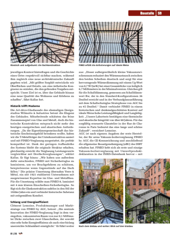 jeweiligen Kontext hinterfragen und die Geschichte eines Ortes respektvoll sichtbar machen, w%u00e4hrend ihm zugleich eine neue architektonische Zukunft gegeben wird. %u201eMit gr%u00f6%u00dfter Sorgfalt entwickeln wir Oberfl%u00e4chen und Details, um eine %u00e4sthetische Kongruenz zu erzielen, die den geltenden Vorgaben entspricht. Unser Ziel ist es, %u00fcber das Geb%u00e4ude hinaus eine neue Qualit%u00e4t des Wohnens und Erlebens zu schaffen%u201c, f%u00e4hrt Kallas fort.Historik trifft ModerneDie Art-d%u00e9co-Glasfassade des ehemaligen Designstudios Wilmotte & Industries betont die Eleganz des Geb%u00e4udes. Mitarbeitende sch%u00e4tzten das feine Zusammenspiel von Glas und Metall, doch die historische Konstruktion entsprach nicht mehr den heutigen energetischen und akustischen Anforderungen. %u201eDa die Eigent%u00fcmergemeinschaft das historische Erscheinungsbild bewahren wollte, haben wir die T-Metalltr%u00e4ger der Unterkonstruktion saniert und mit FINEO-Verglasung ausgestattet, die perfekt kompatibel ist. Dank der geringen Aufbauh%u00f6he des Systems bleibt die originale Struktur erhalten, gleichzeitig erreicht die Verglasung Leistungswerte vergleichbar mit Dreifachverglasungen%u201c, erkl%u00e4rt Kallas. Er f%u00fcgt hinzu: %u201eWir haben uns au%u00dferdem daf%u00fcr entschieden, FINEO mit Sicherheitsglas zu laminieren, um vor Bruchgefahren zu sch%u00fctzen, beispielsweise wenn Gegenst%u00e4nde auf das Dach fallen.%u201c Die pr%u00e4zise Umsetzung %u00fcbernahm Verre & M%u00e9tal, ein seit 1921 etabliertes Unternehmen mit ausgewiesener Expertise im Glas- und Metallbau. F%u00fcr die Umsetzung w%u00e4hlte man FINEO 8, laminiert mit 4 mm klarem Einscheiben-Sicherheitsglas. So f%u00fcgt sich die Glaskonstruktion nahtlos in den Stil der 1930er Jahre ein und verbindet historische Substanz mit zeitgem%u00e4%u00dfem Komfort.Schlang und EnergieeffizientCl%u00e9ment Lemoine, Produktmanager und Marktstratege von FINEO by AGC, betont: %u201eDie zentrale Innovation der FINEO-Verglasung liegt in dem versiegelten, vakuumierten Raum von nur 0,1 Millimeter Dicke zwischen zwei Glasscheiben, der sowohl eine sehr hohe Energieeffizienz als auch eine bislang unerreichte Schlankheit erm%u00f6glicht.%u201c Er f%u00fchrt weiter aus: %u201eDieser au%u00dfergew%u00f6hnlich kleine Vakuumzwischenraum reduziert den W%u00e4rmeaustausch zwischen den beiden Scheiben drastisch und sorgt f%u00fcr eine hervorragende W%u00e4rmed%u00e4mmung mit einem Ug-Wert von 0,7 W/(m%u00b2K) bei einer Gesamtdicke von lediglich 6,7 Millimetern in der Minimalversion. Gleiches gilt f%u00fcr die Schalld%u00e4mmung, gemessen am Schalld%u00e4mmwert Rw, der in den Standard-Konfigurationen 36 Dezibel erreicht und in der Verbundglasausf%u00fchrung mit dem Schallschutzglas Stratophone von AGC bis zu 45 Dezibel.%u201c Damit verbindet FINEO in einem historischen und denkmalgesch%u00fctzten Kontext auf ideale Weise hohe Leistungsf%u00e4higkeit und Langlebigkeit. %u201eUnsere Labortests best%u00e4tigen eine thermische und akustische Integrit%u00e4t von %u00fcber 60 Jahren. F%u00fcr das sorgf%u00e4ltig erneuerte Glasatelier in der Rue de Charonne in Paris bedeutet das eine lange und sch%u00f6ne Zukunft%u201c, versichert Lemoine.AGC ist nach eigenen Angaben der erste Hersteller, der f%u00fcr seine Vakuum-Isolierverglasung FINEO by AGC die CE-Kennzeichnung und anschlie%u00dfend die allgemeine Bauartgenehmigung (aBG) des DIBT erhalten hat. FINEO hebt sich als erste und einzige Vakuum-Isolierverglasung mit Umweltproduktdeklaration in der INIES-Datenbank hervor %u2013 mit Klassisch und aufger%u00e4umt: die Dachkonstruktion FINEO erf%u00fcllt die Anforderungen auf ideale WeiseNach dem Umbau und vorher: Blick auf den GlasbauBaustelle 5901 |26
