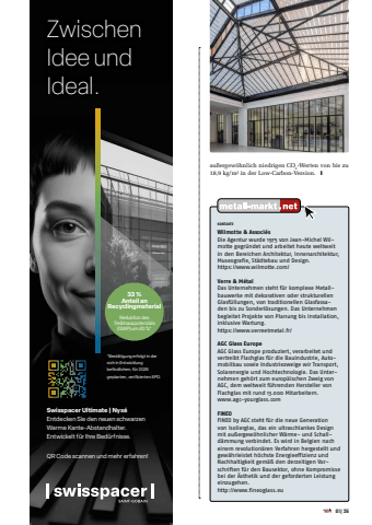 au%u00dfergew%u00f6hnlich niedrigen CO2-Werten von bis zu 18,9 kg/m%u00b2 in der Low-Carbon-Version. yKONTAKTEWilmotte & Associ%u00e9sDie Agentur wurde 1975 von Jean-Michel Wilmotte gegr%u00fcndet und arbeitet heute weltweit in den Bereichen Architektur, Innenarchitektur, Museografie, St%u00e4dtebau und Design. https://www.wilmotte.com/Verre & M%u00e9tal Das Unternehmen steht f%u00fcr komplexe Metallbauwerke mit dekorativen oder strukturellen Glasf%u00fcllungen, von traditionellen Glasfassaden bis zu Sonderl%u00f6sungen. Das Unternehmen begleitet Projekte von Planung bis Installation, inklusive Wartung.https://www.verreetmetal.fr/AGC Glass EuropeAGC Glass Europe produziert, verarbeitet und vertreibt Flachglas f%u00fcr die Bauindustrie, Automobilbau sowie Industriezweige wir Transport, Solarenergie und Hochtechnologie. Das Unternehmen geh%u00f6rt zum europ%u00e4ischen Zweig von AGC, dem weltweit f%u00fchrenden Hersteller von Flachglas mit rund 13.000 Mitarbeitern.www.agc-yourglass.comFINEOFINEO by AGC steht f%u00fcr die neue Generation von Isolierglas, das ein ultraschlankes Design mit au%u00dfergew%u00f6hnlicher W%u00e4rme- und Schalld%u00e4mmung verbindet. Es wird in Belgien nach einem revolution%u00e4ren Verfahren hergestellt und gew%u00e4hrleistet h%u00f6chste Energieeffizienz und Nachhaltigkeit gem%u00e4%u00df den derzeitigen Vorschriften f%u00fcr den Bausektor, ohne Kompromisse bei der %u00c4sthetik und der geforderten Leistung einzugehen. http://www.fineoglass.euZwischen Idee und Ideal.Swisspacer Ultimate | Nyx%u00e9Entdecken Sie den neuen schwarzen Warme Kante-Abstandhalter. Entwickelt f%u00fcr Ihre Bed%u00fcrfnisse.QR Code scannen und mehr erfahren!Reduktion des Treibhauspotenzials (GWP) um 20 %*33 % Anteil an Recyclingmaterial*Best%u00e4tigung erfolgt in der sich in Entwicklung befindlichen, f%u00fcr 2026 geplanten, verifizierten EPD.01|26