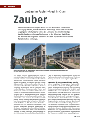 Umbau im Papieri-Areal in ChamZauberIndustriellen Nachnutzungen wohnt oft ein besonderer Zauber inne. Gro%u00dfz%u00fcgige R%u00e4ume, rohe Materialien, weitl%u00e4ufige Areale und der Charme vergangener Jahrhunderte bilden die Leinwand f%u00fcr eine kleinteilige, belebte Neukonzeption des Stadtraums. In der Schweizer Stadt Cham am Nordufer des Zugersees ist derzeit mit dem Papieri-Areal eine solche Transformation im Gange. Teil dessen sind die Maschinenhallen einer geschichtstr%u00e4chtigen Papierfabrik, die Anfang des 20. Jahrhunderts errichtet wurden und noch bis 2015 in Betrieb waren. Das renommierte Z%u00fcrcher B%u00fcro Boltshauser Architekten verwandelte nun den Geb%u00e4udekomplex PM 1-4 in eine besondere Adresse f%u00fcr Kultur, Gewerbe, Wohnlofts und Ateliers. Zentraler Ansatz bei der Sanierung war der Erhalt des industriellen Charakters. Diesen untermalen Fenster- und T%u00fcrelemente mit feuerverzinkten Stahlprofilen von Forster, die die Bestandsarchitektur treffend zitieren. Bis Mitte des 17. Jahrhunderts reicht die Tradition des Papierhandwerks in Cham zur%u00fcck, als die Wasserkraft der Lorze erstmals f%u00fcr eine Papierm%u00fchle genutzt wurde. Die %u00fcber Generationen weitergegebene Unternehmung nahm im Laufe der Zeit industrielle Ma%u00dfst%u00e4be an. Mit dem ersten Holl%u00e4nder %u2013 jener Maschine, die die Fasern verarbeitet %u2013 stieg auch der Bedarf nach ad%u00e4quaten Behausungen f%u00fcr die immer umfangreichere Produktion. Fabrikgeb%u00e4ude, Maschinenhallen, Werk- und Wohnst%u00e4tten wuchsen zu einem stattlichen Industriegel%u00e4nde an. Ab 1913 entstand der erste Holl%u00e4nderbau %u00f6stlich der Lorze, an den sich im Lauf der folgenden 30 Jahre die Papiermaschinenhallen 1-4 anschlossen. F%u00fcr deren Nutzung ist nun ein neues Kapitel angebrochen.Masterplan f%u00fcr ein prestigetr%u00e4chtiges QuartierMit der endg%u00fcltigen Verlagerung der Papierproduktion ins Ausland ebnete sich der Weg f%u00fcr ein bedeutendes Stadtentwicklungsprojekt: Im rund zw%u00f6lf Hektar gro%u00dfen Papieri-Areal sollen bis 2030 rund 4000 Menschen leben und arbeiten. Hierf%u00fcr wird ein nach Kriterien des 2000-Watt-Areals entwickeltes Stadtplanungsprojekt rund um den teils denkmalgesch%u00fctzten Bestand durch hochragende Neubauten nachverdichtet. Die Zeilenbauweise, neue Pl%u00e4tze sowie das Erschlie%u00dfungskonzept schaffen dabei den Spagat zwischen modernem urbanem Quartier und einem tiefen Bewusstsein f%u00fcr die Ortsgeschichte. Der Masterplan folgt nach einem kooperativen Planungsverfahren mit B%u00fcrgerbeteiligung dem st%u00e4dtebaulichen Konzept der B%u00fcros Albi Nussbaumer Architekten aus Zug und Boltshauser Architekten aus Z%u00fcrich. Letztere verantworteten unter anderem den Umbau des rund 250 Meter langen Riegels zwiFotos: Damian Poffet%u00d6stlich der Lorze bildet der langgestreckte Riegel mit den ehemaligen Papiermaschinenhallen die Kulisse f%u00fcr einen lebendigen neuen Stadtraum66 Baustelle01|26