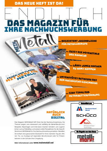 %u2026 begeistert Jugendliche f%u00fcr MetallberufeDas neue Heft ist da!%u2026 zeigt die Potenziale der Branche%u2026 l%u00e4sst junge Macher zu Wort kommen%u2026 gibt Tipps zur Mitarbeiterf%u00fchrung%u2026 unterst%u00fctzt Betriebe bei der Nachwuchs-GewinnungNat%u00fcrlich auch DigitalEndlich das magazin f%u00fcrIhre NachwuchswerbungUnterst%u00fctzt vonDas Magazin MEINMetall hilft Ihnen bei der Nachwuchswerbung. Die Themen zeigen, wie interessant und vielf%u00e4ltig die Metall-Berufe sind. Beispiele, Reportagen und Interviews machen Sch%u00fclern und Jugendlichen Lust auf Metallbau und weisen solide Perspektiven f%u00fcr die Zukunft. Sie k%u00f6nnen MEINMetall f%u00fcr Ihre Nachwuchswerbung einsetzen. Bestellen Sie einfach eine gew%u00fcnschte St%u00fcckzahl f%u00fcr Ihren n%u00e4chsten Tag der offenen T%u00fcr, zur Auslage auf regionalen Berufsmessen oder f%u00fcr Pr%u00e4sen -tationen in den Schulen Ihrer Umgebung. Mehr Informationen unter www.meinmetall.netEin Magazin aus dem Hause