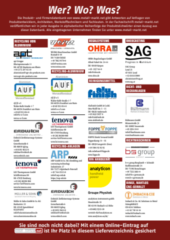 RECYCLING VON ALUMINIUMapt GruppeRheinpromenade 11DE-40789 Monheim am Rhein+49 2173 297 02 10aluminium@apt-alu-products.comwww.apt-alu-products.comA|U|F e.V.Walter-Kolb-Stra%u00dfe 1-7DE-60594 Frankfurt am Main+49 69 955 054-0info@a-u-f.comwww.a-u-f.comErdwich Zerkleinerungs-Systeme GmbHGewerbestra%u00dfe 6DE-86859 Igling+49 8191 9652-0infoline@erdwich.dewww.erdwich.comLOI Thermprocess GmbHSchifferstrasse 80DE-47059 Duisburg+49 203 80398-900service-loi@tenova.comwww.loi.tenova.comM%u00fcller & Sohn GmbH & Co. KGHarkortstr. 22DE-45549 Sprockh%u00f6vel02339 6055info@aluminiumonline.dewww.aluminiumonline.deSie sind noch nicht dabei? Mit einem Online-Eintrag auf ist Ihr Platz in diesem Lieferverzeichnis gesichertSie sind noch nicht dabei? Mit einem Online-Eintrag auf ist Ihr Platz in diesem Lieferverzeichnis gesichertWEIMA Maschinenbau GmbHBustadt 6-10DE-74360 Ilsfeld+49 7062 9570-0info@weima.comwww.weima.comRECYCLING-ALUMINIUMA|U|F e.V.Walter-Kolb-Stra%u00dfe 1-7DE-60594 Frankfurt am Main+49 69 955 054-0info@a-u-f.comwww.a-u-f.comLOI Thermprocess GmbHSchifferstrasse 80DE-47059 Duisburg+49 203 80398-900service-loi@tenova.comwww.loi.tenova.comRECYCLING-ANLAGENARP GmbH & Co. KG shredding and conveying technologyIndustriestr. 37DE-72275 Alpirsbach-Peterzell+49 7444 9515-0info@arp-mb.dehttps://arp-mb.deErdwich Zerkleinerungs-Systeme GmbHGewerbestra%u00dfe 6DE-86859 Igling+49 8191 9652-0infoline@erdwich.dewww.erdwich.comREGALSYSTEMEOHRA Regalanlagen GmbHAlfred-Nobel-Str. 24-44DE-50169 Kerpen+49- 2237 64-0info@ohra.dewww.ohra.deREINIGUNGSMITTELAlufinish GmbH & Co.KGOtto-Wolff-Str. 5 - 15DE-56626 Andernach+49 2632 9297 0info@alufinish.dewww.alufinish.deFOPPE Direkt Versand GmbHFoppenkamp 14 - 16DE-49838 Lengerich (Ems)+49 5904 93 93 93info.zubehoer@foppe.dewww.foppe.deRFA HANDGER%u00c4Tanalyticon instruments gmbhDieselstra%u00dfe 18DE-61191 Rosbach v.d. H%u00f6he+49 6003 9355-20vertrieb-rfa@analyticon.euwww.analyticon.eu/de/RHEOCASTINGSAG GroupLend 25AT-5651 Lend+43 6416 65000aluminium@sag.atwww.sag.atRICHT- UND RECKANLAGENB%u00fcltmann GmbHH%u00f6nnestra%u00dfe 31DE-58809 Neuenrade+49 2394 18-0info@bueltmann.comwww.bueltmann.comRICHTMASCHINENb+s group Burghardt + SchmidtRaiffeisenstra%u00dfe 24DE-75196 Remchingen+49 7232 3661-0info@b-s-germany.dewww.b-s-germany.deRINGE, NAHTLOS CNC-GEWALZTImbach & Cie. AG Solutions in MetalSt%u00e4mpfelfeld 9CH-6244 Nebikon+41 62 748 44 44imbach@imbach.comwww.imbach.com70 Lieferquellen Wer? Wo? Was?Die Produkt- und Firmendatenbank von www.metall-markt.net gibt Antworten auf Anfragen vonProduktentwicklern, Architekten, Werkstofftechnikern und Fachleuten. In der Fachzeitschrift metall-markt.net ver%u00f6ffentlichen wir in jeder Ausgabe in alphabetischer Reihenfolge der Produktstichw%u00f6rter einen Auszug aus dieser Datenbank. Alle eingetragenen Unternehmen finden Sie unter www.metall-markt.net