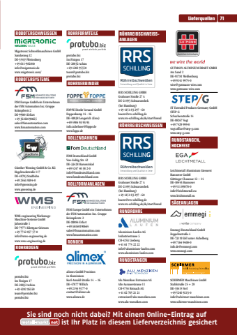 Sie sind noch nicht dabei? Mit einem Online-Eintrag auf ist Ihr Platz in diesem Lieferverzeichnis gesichertSie sind noch nicht dabei? Mit einem Online-Eintrag auf ist Ihr Platz in diesem Lieferverzeichnis gesichertROBOTERSCHWEISSENMigatronic Schwei%u00dfmaschinen GmbHSandusweg 12DE-35435 Wettenberg+49 641-982840info@migatronic.dewww.migatronic.com/ROBOTERSYSTEMEFSM Europe GmbH ein Unternehmen der FSM Automation Inc. GruppeKr%u00e4mpferstr.2DE-99084 Erfurt+49 36160190665sales@fsmautomation.comwww.fsmautomation.comG%u00fcnther Wensing GmbH & Co. KGHegebrockstra%u00dfe 117DE-48703 Stadtlohn+49 2563 9394-0info@gwensing.dewww.gwensing.deWMS-engineering WerkzeugeMaschine-Systeme GmbHJahnstra%u00dfe 1DE-79771 Klettgau-Griessen+49 7742 857 57-0info@wms-engineering.dewww.wms-engineering.deROHRBOGENprotubo.bizIm Finigen 17DE-28832 Achim+49 4202 95550team@protubo.bizprotubo.bizROHRFORMTEILEprotubo.bizIm Finigen 17DE-28832 Achim+49 4202 95550team@protubo.bizprotubo.bizROHRVERBINDERFOPPE Direkt Versand GmbHFoppenkamp 14 - 16DE-49838 Lengerich (Ems)+49 5904 93 93 93info.zubehoer@foppe.dewww.foppe.deROLLENBAHNENFOM Deutschland GmbHVon-Liebig-Str. 42DE-33428 Harsewinkel+49 5247 40 38 2-0info@fomdeutschland.comwww.fomdeutschland.comROLLFORMANLAGENFSM Europe GmbH ein Unternehmen der FSM Automation Inc. GruppeKr%u00e4mpferstr. 2DE-99084 Erfurt+49 36160190665sales@fsmautomation.comwww.fsmautomation.comRONDEN alimex GmbH Precision in AluminiumKarl-Arnold-Stra%u00dfe 14 %u2013 16DE-47877 Willich+49 2154 9177-0contact@alimex.dewww.alimex.deR%u00dcHRREIBSCHWEISSANLAGENRRSSCHILLINGR%u00fchrreibschwei%u00dfenEntwicklung und Qualit%u00e4t in SerieRRS SCHILLING GMBHGrabauer Stra%u00dfe 27 ADE-21493 Schwarzenbek(bei Hamburg)+49 4151 83 297 - 60buero@rrs-schilling.dewww.rrs-schilling.de/de/start?lnwsdR%u00dcHRREIBSCHWEISSENRRSSCHILLINGR%u00fchrreibschwei%u00dfenEntwicklung und Qualit%u00e4t in SerieRRS SCHILLING GMBHGrabauer Stra%u00dfe 27 ADE-21493 Schwarzenbek (bei Hamburg)+49 4151 83 297 - 60buero@rrs-schilling.dewww.rrs-schilling.de/de/start?lnwsdRUNDROHREAluminium Laufen AGIndustriestrasse 5CH-4253 Liesberg+41 61 775 22 22info@aluminium-laufen.comwww.aluminium-laufen.comRUNDSTANGENAlu Menziken Extrusion AGAlte Aarauerstrasse 11CH-5734 Reinach AG+41 62 765 21 21extrusion@alu-menziken.comwww.alu-menziken.comGUTMANN ALUMINIUM DRAHT GMBHAm Sand 2DE-91781 Wei%u00dfenburg+49 9141 9975-0wire@gutmann-wire.comwww.gutmann-wire.comST Extruded Products Germany GmbH STEP-GSchachenstra%u00dfe 14DE-88267 Vogt+49 7529 999-0vogt.office@step-g.comwww.step-g.comRUNDSTANGEN, HOCHFESTLeichtmetall Aluminium Giesserei Hannover GmbHG%u00f6ttinger Chaussee 12 %u2013 14DE-30453 Hannover+49 511 89878-0info@leichtmetall.euwww.leichtmetall.euS%u00c4GEANLAGENEmmegi Deutschland GmbHZeppelinstra%u00dfe 4DE-73119 Zell unter Aichelberg+49 7164 9400-0info.de@emmegi.comwww.emmegi.comSCHIRMER Maschinen GmbHStahlstra%u00dfe 25 + 29DE-33415 Verl+49 5246 9213-0info@schirmer-maschinen.comwww.schirmer-maschinen.comLieferquellen 71