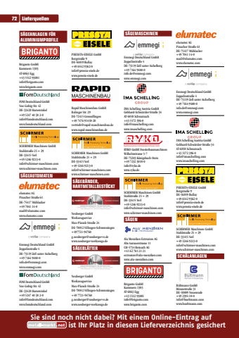 Sie sind noch nicht dabei? Mit einem Online-Eintrag auf ist Ihr Platz in diesem Lieferverzeichnis gesichertS%u00c4GEANLAGEN F%u00dcR ALUMINIUMPROFILEBriganto GmbHKammern 1303AT-6863 Egg+43 5512 93081info@briganto.comwww.briganto.comFOM Deutschland GmbHVon-Liebig-Str. 42DE-33428 Harsewinkel+49 5247 40 38 2-0info@fomdeutschland.comwww.fomdeutschland.comSCHIRMER Maschinen GmbHStahlstra%u00dfe 25 + 29DE-33415 Verl+49 5246 9213-0info@schirmer-maschinen.comwww.schirmer-maschinen.comS%u00c4GEAUTOMATENelumatec AGPinacher Stra%u00dfe 61DE-75417 M%u00fchlacker+49 7041 14-0mail@elumatec.comwww.elumatec.comEmmegi Deutschland GmbHZeppelinstra%u00dfe 4DE-73119 Zell unter Aichelberg+49 7164 9400-0info.de@emmegi.comwww.emmegi.comFOM Deutschland GmbHVon-Liebig-Str. 42DE-33428 Harsewinkel+49 5247 40 38 2-0info@fomdeutschland.comwww.fomdeutschland.comPRESSTA-EISELE GmbHBergstra%u00dfe 9DE-56859 Bullay+49 6542 9362-0info@pressta-eisele.dewww.pressta-eisele.deRapid Maschinenbau GmbHBalinger Str. 29DE-72415 Grosselfingen+49 7476 91458-20vertrieb@rapid-maschinenbau.dewww.rapid-maschinenbau.deSCHIRMER Maschinen GmbHStahlstra%u00dfe 25 + 29DE-33415 Verl+49 5246 9213-0info@schirmer-maschinen.comwww.schirmer-maschinen.comS%u00c4GEB%u00c4NDER, HARTMETALLBEST%u00dcCKTNeuberger GmbH WerkzeugserviceMax-Planck-Stra%u00dfe 24DE-78052 Villingen-Schwenningen+497721-94760g.neuberger@neuberger-vs.dewww.neuberger-werkzeuge.deS%u00c4GEBL%u00c4TTERNeuberger GmbH WerkzeugserviceMax-Planck-Stra%u00dfe 24DE-78052 Villingen-Schwenningen+49 7721-94760g.neuberger@neuberger-vs.dewww.neuberger-werkzeuge.deS%u00c4GEMASCHINENEmmegi Deutschland GmbHZeppelinstra%u00dfe 4DE-73119 Zell unter Aichelberg+49 7164 9400-0info.de@emmegi.comwww.emmegi.comIMA Schelling Austria GmbHGebhard-Schw%u00e4rzler-Stra%u00dfe 34AT-6858 Schwarzach+43 5572 396-0info@imaschelling.comwww.imaschelling.comRYKO GmbH FensterbaumaschinenWilhelmstrasse 5-7DE-75203 K%u00f6nigsbach-Stein+49 7232 3018-0info@ryko.dewww.ryko.deSCHIRMER Maschinen GmbHStahlstra%u00dfe 25 + 29DE-33415 Verl+49 5246 9213-0info@schirmer-maschinen.comwww.schirmer-maschinen.comS%u00c4GENAlu Menziken Extrusion AGAlte Aarauerstrasse 11CH-5734 Reinach AG+41 62 765 21 21extrusion@alu-menziken.comwww.alu-menziken.comBriganto GmbHKammern 1303AT-6863 Egg+43 5512 93081info@briganto.comwww.briganto.comelumatec AGPinacher Stra%u00dfe 61DE-75417 M%u00fchlacker+49 7041 14-0mail@elumatec.comwww.elumatec.comEmmegi Deutschland GmbHZeppelinstra%u00dfe 4DE-73119 Zell unter Aichelberg+49 7164 9400-0info.de@emmegi.comwww.emmegi.comIMA Schelling Austria GmbHGebhard-Schw%u00e4rzler-Stra%u00dfe 34AT-6858 Schwarzach+43 5572 396-0info@imaschelling.comwww.imaschelling.comPRESSTA-EISELE GmbHBergstra%u00dfe 9DE-56859 Bullay+49 6542 9362-0info@pressta-eisele.dewww.pressta-eisele.deSCHIRMER Maschinen GmbHStahlstra%u00dfe 25 + 29DE-33415 Verl+49 5246 9213-0info@schirmer-maschinen.comwww.schirmer-maschinen.comSCH%u00c4LANLAGENB%u00fcltmann GmbHH%u00f6nnestra%u00dfe 31DE-58809 Neuenrade+49 2394 18-0info@bueltmann.comwww.bueltmann.com72 Lieferquellen