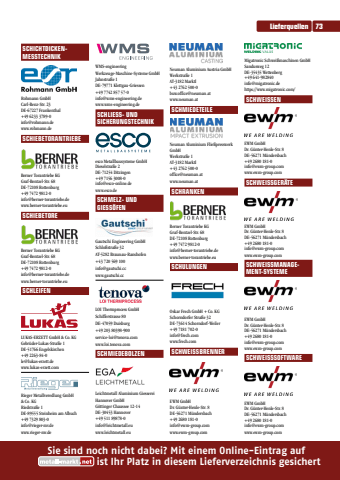 Sie sind noch nicht dabei? Mit einem Online-Eintrag auf ist Ihr Platz in diesem Lieferverzeichnis gesichertSie sind noch nicht dabei? Mit einem Online-Eintrag auf ist Ihr Platz in diesem Lieferverzeichnis gesichertSCHICHTDICKENMESSTECHNIKRohmann GmbHCarl-Benz-Str. 23DE-67227 Frankenthal+49 6233 3789-0info@rohmann.dewww.rohmann.deSCHIEBETORANTRIEBEBerner Torantriebe KGGraf-Bentzel-Str. 68DE-72108 Rottenburg+49 7472 9812-0info@berner-torantriebe.dewww.berner-torantriebe.euSCHIEBETOREBerner Torantriebe KGGraf-Bentzel-Str. 68DE-72108 Rottenburg+49 7472 9812-0info@berner-torantriebe.dewww.berner-torantriebe.euSCHLEIFENLUKAS-ERZETT GmbH & Co. KGGebr%u00fcder-Lukas-Stra%u00dfe 1DE-51766 Engelskirchen+49 2263-84-0le@lukas-erzett.dewww.lukas-erzett.comRieger Metallveredlung GmbH & Co. KGRiedstra%u00dfe 1DE-89555 Steinheim am Albuch+49 7329 803-0info@rieger-mv.dewww.rieger-mv.deWMS-engineering Werkzeuge-Maschine-Systeme GmbHJahnstra%u00dfe 1DE-79771 Klettgau-Griessen+49 7742 857 57-0info@wms-engineering.dewww.wms-engineering.deSCHLIESS- UND SICHERUNGSTECHNIKesco Metallbausysteme GmbHDieselstra%u00dfe 2DE-71254 Ditzingen+49 7156 3008-0info@esco-online.dewww.esco.deSCHMELZ- UND GIESS%u00d6FENGautschi Engineering GmbHSchlo%u00dfstra%u00dfe 32AT-5282 Braunau-Ranshofen+43 720 569 100info@gautschi.ccwww.gautschi.ccLOI Thermprocess GmbHSchifferstrasse 80DE-47059 Duisburg+49 203 80398-900service-loi@tenova.comwww.loi.tenova.comSCHMIEDEBOLZENLeichtmetall Aluminium Giesserei Hannover GmbHG%u00f6ttinger Chaussee 12-14DE-30453 Hannover+49 511 89878-0info@leichtmetall.euwww.leichtmetall.euNeuman Aluminium Austria GmbHWerkstra%u00dfe 1AT-3182 Marktl+43 2762 500-0buw.office@neuman.atwww.neuman.atSCHMIEDETEILENeuman Aluminium Flie%u00dfpresswerk GmbHWerkstra%u00dfe 1AT-3182 Marktl+43 2762 500-0office@neuman.atwww.neuman.atSCHRANKENBerner Torantriebe KGGraf-Bentzel-Str. 68DE-72108 Rottenburg+49 7472 9812-0info@berner-torantriebe.dewww.berner-torantriebe.euSCHULUNGENOskar Frech GmbH + Co. KGSchorndorfer Stra%u00dfe 32DE-73614 Schorndorf-Weiler+49 7181 702-0info@frech.comwww.frech.comSCHWEISSBRENNEREWM GmbHDr. G%u00fcnter-Henle-Str. 8DE-56271 M%u00fcndersbach+49 2680 181-0info@ewm-group.comwww.ewm-group.comMigatronic Schwei%u00dfmaschinen GmbHSandusweg 12DE-35435 Wettenberg+49 641-982840info@migatronic.dehttps://www.migatronic.com/SCHWEISSENEWM GmbHDr. G%u00fcnter-Henle-Str. 8DE-56271 M%u00fcndersbach+49 2680 181-0info@ewm-group.comwww.ewm-group.comSCHWEISSGER%u00c4TEEWM GmbHDr. G%u00fcnter-Henle-Str. 8DE-56271 M%u00fcndersbach+49 2680 181-0info@ewm-group.comwww.ewm-group.comSCHWEISSMANAGEMENT-SYSTEMEEWM GmbHDr. G%u00fcnter-Henle-Str. 8DE-56271 M%u00fcndersbach+49 2680 181-0info@ewm-group.comwww.ewm-group.comSCHWEISSSOFTWAREEWM GmbHDr. G%u00fcnter-Henle-Str. 8DE-56271 M%u00fcndersbach+49 2680 181-0info@ewm-group.comwww.ewm-group.comLieferquellen 73