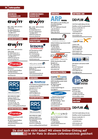 Sie sind noch nicht dabei? Mit einem Online-Eintrag auf ist Ihr Platz in diesem Lieferverzeichnis gesichertSie sind noch nicht dabei? Mit einem Online-Eintrag auf ist Ihr Platz in diesem Lieferverzeichnis gesichertSie sind noch nicht dabei? Mit einem Online-Eintrag auf ist Ihr Platz in diesem Lieferverzeichnis gesichertSCHWEISSSTROMQUELLENEWM GmbHDr. G%u00fcnter-Henle-Str. 8DE-56271 M%u00fcndersbach+49 2680 181-0info@ewm-group.comwww.ewm-group.comSCHWEISSTECHNIKEWM GmbHDr. G%u00fcnter-Henle-Str. 8DE-56271 M%u00fcndersbach+49 2680 181-0info@ewm-group.comwww.ewm-group.comFRONIUS Deutschland GmbHFroniusstr. 1DE-36119 Neuhof-Dorfborn+49 6655 916 94-0sales.germany@fronius.comwww.fronius.deSCHWEISSWERKZEUGERRSSCHILLINGR%u00fchrreibschwei%u00dfenEntwicklung und Qualit%u00e4t in SerieRRS SCHILLING GMBHGrabauer Stra%u00dfe 27 ADE-21493 Schwarzenbek (bei Hamburg)+49 4151 83 297 - 60buero@rrs-schilling.dewww.rrs-schilling.de/de/start?lnwsdSCHWEISSZUBEH%u00d6RFRONIUS Deutschland GmbHFroniusstr. 1DE-36119 Neuhof-Dorfborn+49 6655 916 94-0sales.germany@fronius.comwww.fronius.deSCHWEISSZUSATZWERKSTOFFEEWM GmbHDr. G%u00fcnter-Henle-Str. 8DE-56271 M%u00fcndersbach+49 2680 181-0info@ewm-group.comwww.ewm-group.comSEKUND%u00c4RALUMINIUMHERSTELLUNGLOI Thermprocess GmbHSchifferstrasse 80DE-47059 Duisburg+49 203 80398-900service-loi@tenova.comwww.loi.tenova.comM%u00fcller & Sohn GmbH & Co. KGHarkortstr. 22DE-45549 Sprockh%u00f6vel02339 6055info@aluminiumonline.dewww.aluminiumonline.deSEMINAREWirtschaftsberatungsgesellschaft mbH im Bundesverband MetallAltendorfer Str. 97-101DE-45143 Essen+492018961940info@metallportal.dewww.metallportal.deSERIENFERTIGUNGRRSSCHILLINGR%u00fchrreibschwei%u00dfenEntwicklung und Qualit%u00e4t in SerieRRS SCHILLING GMBHGrabauer Stra%u00dfe 27 ADE-21493 Schwarzenbek (bei Hamburg)+49 4151 83 297 - 60buero@rrs-schilling.dewww.rrs-schilling.de/de/start?lnwsdSHREDDERARP GmbH & Co. KG shredding and conveying technologyIndustriestr. 37DE-72275 Alpirsbach-Peterzell+49 7444 9515-0info@arp-mb.dehttps://arp-mb.deErdwich Zerkleinerungs-Systeme GmbHGewerbestra%u00dfe 6DE-86859 Igling+49 8191 9652-0infoline@erdwich.dewww.erdwich.comWEIMA Maschinenbau GmbHBustadt 6-10DE-74360 Ilsfeld+49 7062 9570-0info@weima.comwww.weima.comSICHERHEITST%u00dcRENFOPPE Metallbaumodule GmbHFoppenkamp 18DE-49838 Lengerich+49 5904 950-0vertrieb.module@foppe.dewww.foppe.deNovoferm Vertriebs GmbHSch%u00fcttensteiner Str. 26DE-46419 Isselburg - Werth+49 2850 910-700vertrieb@novoferm.dewww.novoferm.deSIMULATIONSSOFTWAREAtie Uno Informatica S.r.l. ItalienVia Macon 30IT-23900 Lecco+39 366 8022058marcelo.aiello@atieuno.comwww.atieuno.deSOFTWARE CADCAD-PLAN GmbH Software f%u00fcr den Metallbau und die FassadentechnikHanauer Landstra%u00dfe 174DE-60314 Frankfurt+49 69 800 818-0info@cad-plan.comwww.cad-plan.comp software solutions karlsruhe germanycamProx oHGAkademiestr. 17/19DE-76133 Karlsruhe+49 721 9899-500info@camprox.comwww.camprox.comISD Software und Systeme GmbHHauert 4DE-44227 Dortmund+49 231 9793-0info@isdgroup.comwww.isdgroup.comSYSCAD TEAM GmbHZiegelh%u00fctte 18DE-91236 Alfeld+49 09157 997 9994syscad@syscad-team.dewww.metallbau-cad.deSOFTWARE CAD/CAMCAD-PLAN GmbH Software f%u00fcr den Metallbau und die FassadentechnikHanauer Landstra%u00dfe 174DE-60314 Frankfurt+49 69 800 818-0info@cad-plan.comwww.cad-plan.com74 Lieferquellen