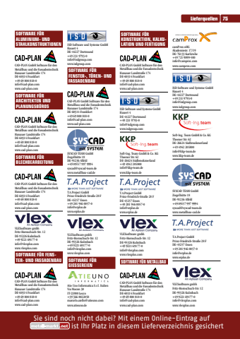 Sie sind noch nicht dabei? Mit einem Online-Eintrag auf ist Ihr Platz in diesem Lieferverzeichnis gesichertSOFTWARE F%u00dcR ALUMINIUM- UND STAHLKONSTRUKTIONENCAD-PLAN GmbH Software f%u00fcr den Metallbau und die FassadentechnikHanauer Landstra%u00dfe 174DE-60314 Frankfurt+49 69 800 818-0info@cad-plan.comwww.cad-plan.comSOFTWARE F%u00dcR ARCHITEKTEN UND PLANUNGSB%u00dcROSCAD-PLAN GmbH Software f%u00fcr den Metallbau und die FassadentechnikHanauer Landstra%u00dfe 174DE-60314 Frankfurt+49 69 800 818-0info@cad-plan.comwww.cad-plan.comSOFTWARE F%u00dcR BLECHBEARBEITUNGCAD-PLAN GmbH Software f%u00fcr den Metallbau und die FassadentechnikHanauer Landstra%u00dfe 174DE-60314 Frankfurt+49 69 800 818-0info@cad-plan.comwww.cad-plan.comVLEXsoftware gmbhFritz-Hornschuch-Str. 12DE-95326 Kulmbach+49 9221 69177-0info@vlexplus.comwww.vlexplus.comSOFTWARE F%u00dcR FENSTER- UND FASSADENBAUCAD-PLAN GmbH Software f%u00fcr den Metallbau und die FassadentechnikHanauer Landstra%u00dfe 174DE-60314 Frankfurt+49 69 800 818-0info@cad-plan.comwww.cad-plan.comISD Software und Systeme GmbHHauert 4DE-44227 Dortmund+49 231 9793-0info@isdgroup.comwww.isdgroup.comSOFTWARE F%u00dcR FENSTER-, T%u00dcREN- UND FASSADENBAUCAD-PLAN GmbH Software f%u00fcr den Metallbau und die FassadentechnikHanauer Landstra%u00dfe 174DE-60314 Frankfurt+49 69 800 818-0info@cad-plan.comwww.cad-plan.comSYSCAD TEAM GmbHZiegelh%u00fctte 18DE-91236 Alfeld+49 09157 997 9994syscad@syscad-team.dewww.metallbau-cad.deT.A.Project GmbHPrinz-Friedrich-Stra%u00dfe 28 FDE-45257 Essen+49 201 946 0057-0info@erplus.dewww.erplus.deVLEXsoftware gmbhFritz-Hornschuch-Str. 12DE-95326 Kulmbach+49 9221 69177-0info@vlexplus.comwww.vlexplus.comSOFTWARE F%u00dcR GIESSEREIENAtie Uno Informatica S.r.l. ItalienVia Macon 30IT-23900 Lecco+39 366 8022058marcelo.aiello@atieuno.comwww.atieuno.deSOFTWARE F%u00dcR KONSTRUKTION, KALKULATION UND FERTIGUNGCAD-PLAN GmbH Software f%u00fcr den Metallbau und die FassadentechnikHanauer Landstra%u00dfe 174DE-60314 Frankfurt+49 69 800 818-0info@cad-plan.comwww.cad-plan.comISD Software und Systeme GmbHHauert 4DE-44227 Dortmund+49 231 9793-0info@isdgroup.comwww.isdgroup.comSoft-Ing. Team GmbH & Co. KGTheener Str. 62DE-26624 S%u00fcdbrookmerland+49 4942 205800info@kkp-team.dewww.kkp-team.deT.A.Project GmbHPrinz-Friedrich-Stra%u00dfe 28 FDE-45257 Essen+49 201 946 0057-0info@erplus.dewww.erplus.deVLEXsoftware gmbhFritz-Hornschuch-Str. 12DE-95326 Kulmbach+49 9221 69177-0info@vlexplus.comwww.vlexplus.comSOFTWARE F%u00dcR METALLBAUCAD-PLAN GmbH Software f%u00fcr den Metallbau und die FassadentechnikHanauer Landstra%u00dfe 174DE-60314 Frankfurt+49 69 800 818-0info@cad-plan.comwww.cad-plan.comp software solutions karlsruhe germanycamProx oHGAkademiestr. 17/19DE-76133 Karlsruhe+49 721 9899-500info@camprox.comwww.camprox.comISD Software und Systeme GmbHHauert 4DE-44227 Dortmund+49 231 9793-0info@isdgroup.comwww.isdgroup.comSoft-Ing. Team GmbH & Co. KGTheener Str. 62DE-26624 S%u00fcdbrookmerland+49 4942 205800info@kkp-team.dewww.kkp-team.deSYSCAD TEAM GmbHZiegelh%u00fctte 18DE-91236 Alfeld+49 09157 997 9994syscad@syscad-team.dewww.metallbau-cad.deT.A.Project GmbHPrinz-Friedrich-Stra%u00dfe 28 FDE-45257 Essen+49 201 946 0057-0info@erplus.dewww.erplus.deVLEXsoftware gmbhFritz-Hornschuch-Str. 12DE-95326 Kulmbach+49 9221 69177-0info@vlexplus.comwww.vlexplus.comLieferquellen 75