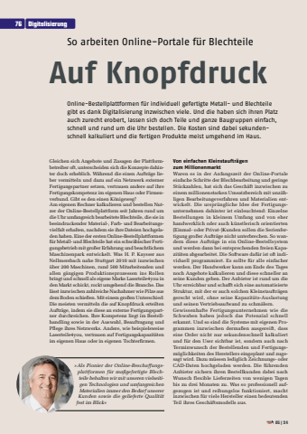 So arbeiten Online-Portale f%u00fcr BlechteileAuf KnopfdruckOnline-Bestellplattformen f%u00fcr individuell gefertigte Metall- und Blechteile gibt es dank Digitalisierung inzwischen viele. Und die haben sich ihren Platz auch zurecht erobert, lassen sich doch Teile und ganze Baugruppen einfach, schnell und rund um die Uhr bestellen. Die Kosten sind dabei sekundenschnell kalkuliert und die fertigen Produkte meist umgehend im Haus.Gleichen sich Angebote und Zusagen der Plattformbetreiber oft, unterscheiden sich die Konzepte dahinter doch erheblich. W%u00e4hrend die einen Auftr%u00e4ge lieber vermitteln und dazu auf ein Netzwerk externer Fertigungspartner setzen, vertrauen andere auf ihre Fertigungskompetenz im eigenen Haus oder Firmenverbund. Gibt es den einen K%u00f6nigsweg? Am eigenen Rechner kalkulieren und bestellen Nutzer der Online-Bestellplattform seit Jahren rund um die Uhr umfangreich bearbeitete Blechteile, die sie in beeindruckender Material-, Farb- und Bearbeitungsvielfalt erhalten, nachdem sie ihre Dateien hochgeladen haben. Eine der ersten Online-Bestellplattformen f%u00fcr Metall- und Blechteile hat ein schw%u00e4bischer Fertigungsbetrieb mit gro%u00dfer Erfahrung und beachtlichem Maschinenpark entwickelt. Was H.%u00a0P. Kaysser aus Nellmersbach nahe Stuttgart 2010 mit inzwischen %u00fcber 200 Maschinen, rund 500 Mitarbeitenden und allen g%u00e4ngigen Produktionsprozessen ins Rollen bringt und schnell als eigene Marke Laserteile4you in den Markt schickt, rockt umgehend die Branche. Das l%u00e4sst inzwischen zahlreiche Nachahmer wie Pilze aus dem Boden schie%u00dfen. Mit einem gro%u00dfen Unterschied: Die meisten vermitteln die auf Knopfdruck erteilten Auftr%u00e4ge, indem sie diese an externe Fertigungspartner durchreichen. Ihre Kompetenz liegt im Bestellhandling sowie in der Auswahl, Beauftragung und Pflege ihres Netzwerks. Andere, wie beispielsweise Laserteile4you, vertrauen auf Fertigungskapazit%u00e4ten im eigenen Haus oder in eigenen Tochterfirmen.Von einfachen Kleinstauftr%u00e4gen zum Millionenmarkt Waren es in der Anfangszeit der Online-Portale einfache Schritte der Blechbearbeitung und geringe St%u00fcckzahlen, hat sich das Gesch%u00e4ft inzwischen zu einem millionenstarken Umsatzbereich mit unz%u00e4hligen Bearbeitungsverfahren und Materialien entwickelt. Die urspr%u00fcngliche Idee der Fertigungsunternehmen dahinter ist einleuchtend: Einzelne Bestellungen in kleinem Umfang und von eher handwerklich oder auch k%u00fcnstlerisch orientierten (Einmal- oder Privat-)Kunden sollen die Serienfertigung gro%u00dfer Auftr%u00e4ge nicht unterbrechen. So wandern diese Auftr%u00e4ge in ein Online-Bestellsystem und werden dann bei entsprechenden freien Kapazit%u00e4ten abgearbeitet. Die Software daf%u00fcr ist oft individuell programmiert. Es sollte f%u00fcr alle einfacher werden. Der Handwerker kann am Ende des Tages noch Angebote kalkulieren und diese schneller an seine Kunden geben. Der Anbieter ist rund um die Uhr erreichbar und schafft sich eine automatisierte Struktur, mit der er auch solchen Kleinstauftr%u00e4gen gerecht wird, ohne seine Kapazit%u00e4ts-Auslastung und seinen Vertriebsaufwand zu schm%u00e4lern.Gewissenhafte Fertigungsunternehmen wie die Schwaben haben jedoch das Potenzial schnell erkannt. Und so sind die Systeme mit eigenen Programmen inzwischen derma%u00dfen ausgereift, dass eine Order nicht nur sekundenschnell kalkuliert und f%u00fcr den User sichtbar ist, sondern auch nach Terminwunsch der Bestellenden und Fertigungsm%u00f6glichkeiten des Herstellers eingeplant und zugesagt wird. Dazu m%u00fcssen lediglich Zeichnungs- oder CAD-Daten hochgeladen werden. Die f%u00fchrenden Anbieter sichern ihren Bestellkunden dabei nach Wunsch flexible Lieferzeiten von wenigen Tagen bis zu drei Monaten zu. Was so professionell aufgezogen ist und reibungslos funktioniert, macht inzwischen f%u00fcr viele Hersteller einen bedeutenden Teil ihres Gesch%u00e4ftsmodells aus.%u00bbAls Pionier der Online-Beschaffungsplattformen f%u00fcr ma%u00dfgefertigte Blechteile behalten wir mit unseren vielseitigen Technologien und umfangreichen Materialien immer den Bedarf unserer Kunden sowie die gelieferte Qualit%u00e4t fest im Blick%u00ab76 Digitalisierung05| 24