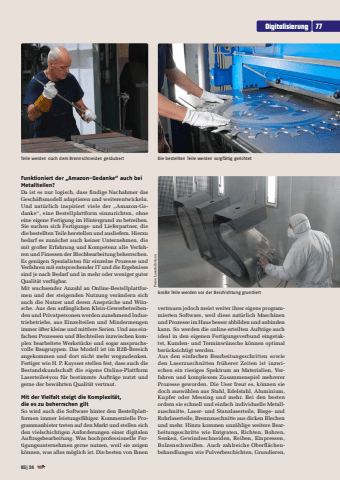 Funktioniert der %u201eAmazon-Gedanke%u201c auch bei Metallteilen?Da ist es nur logisch, dass findige Nachahmer das Gesch%u00e4ftsmodell adaptieren und weiterentwickeln. Und nat%u00fcrlich inspiriert viele der %u201eAmazon-Gedanke%u201c, eine Bestellplattform einzurichten, ohne eine eigene Fertigung im Hintergrund zu betreiben. Sie suchen sich Fertigungs- und Lieferpartner, die die bestellten Teile herstellen und ausliefern. Hierzu bedarf es zun%u00e4chst auch keiner Unternehmen, die mit gro%u00dfer Erfahrung und Kompetenz alle Verfahren und Finessen der Blechbearbeitung beherrschen. Es gen%u00fcgen Spezialisten f%u00fcr einzelne Prozesse und Verfahren mit entsprechender IT und die Ergebnisse sind je nach Bedarf und in mehr oder weniger guter Qualit%u00e4t verf%u00fcgbar. Mit wachsender Anzahl an Online-Bestellplattformen und der steigenden Nutzung ver%u00e4ndern sich auch die Nutzer und deren Anspr%u00fcche und W%u00fcnsche. Aus den anf%u00e4nglichen Klein-Gewerbetreibenden und Privatpersonen werden zunehmend Industriebetriebe, aus Einzelteilen und Mindermengen immer %u00f6fter kleine und mittlere Serien. Und aus einfachen Prozessen und Blechteilen inzwischen komplex bearbeitete Werkst%u00fccke und sogar anspruchsvolle Baugruppen. Das Modell ist im B2B-Bereich angekommen und dort nicht mehr wegzudenken. Fertiger wie H.%u00a0P. Kaysser stellen fest, dass auch die Bestandskundschaft die eigene Online-Plattform Laserteile4you f%u00fcr bestimmte Auftr%u00e4ge nutzt und gerne der bew%u00e4hrten Qualit%u00e4t vertraut.Mit der Vielfalt steigt die Komplexit%u00e4t, die es zu beherrschen giltSo wird auch die Software hinter den Bestellplattformen immer leistungsf%u00e4higer. Kommerzielle Programmanbieter treten auf den Markt und stellen sich den vielschichtigen Anforderungen einer digitalen Auftragsbearbeitung. Was hochprofessionelle Fertigungsunternehmen gerne nutzen, weil sie zeigen k%u00f6nnen, was alles m%u00f6glich ist. Die besten von Ihnen vertrauen jedoch meist weiter ihrer eigens programmierten Software, weil diese nat%u00fcrlich Maschinen und Prozesse im Haus besser abbilden und anbinden kann. So werden die online erteilten Auftr%u00e4ge auch ideal in den eigenen Fertigungsverbund eingetaktet, Kunden- und Terminw%u00fcnsche k%u00f6nnen optimal ber%u00fccksichtigt werden.Aus den einfachen Bearbeitungsschritten sowie den Laserzuschnitten fr%u00fcherer Zeiten ist inzwischen ein riesiges Spektrum an Materialien, Verfahren und komplexem Zusammenspiel mehrerer Prozesse geworden. Die User freut es, k%u00f6nnen sie doch ausw%u00e4hlen aus Stahl, Edelstahl, Aluminium, Kupfer oder Messing und mehr. Bei den besten ordern sie schnell und einfach individuelle Metallzuschnitte, Laser- und Stanzlaserteile, Biege- und Rohrlaserteile, Brennzuschnitte aus dicken Blechen und mehr. Hinzu kommen unz%u00e4hlige weitere Bearbeitungsschritte wie Entgraten, Richten, Bohren, Senken, Gewindeschneiden, Reiben, Einpressen, Bolzenschwei%u00dfen. Auch zahlreiche Oberfl%u00e4chenbehandlungen wie Pulverbeschichten, Grundieren, Teile werden nach dem Brennschneiden ges%u00e4ubert Die bestellten Teile werden sorgf%u00e4ltig gerichtetGro%u00dfe Teile werden vor der Beschichtung grundiertFotos: Laserteile4youDigitalisierung 7705| 24