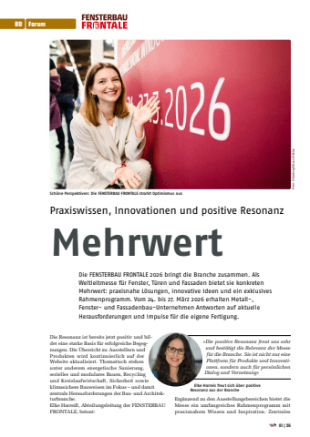 Praxiswissen, Innovationen und positive ResonanzMehrwertDie FENSTERBAU FRONTALE 2026 bringt die Branche zusammen. Als Weltleitmesse f%u00fcr Fenster, T%u00fcren und Fassaden bietet sie konkreten Mehrwert: praxisnahe L%u00f6sungen, innovative Ideen und ein exklusives Rahmenprogramm. Vom 24. bis 27. M%u00e4rz 2026 erhalten Metall-, Fenster- und Fassadenbau-Unternehmen Antworten auf aktuelle Herausforderungen und Impulse f%u00fcr die eigene Fertigung.Die Resonanz ist bereits jetzt positiv und bildet eine starke Basis f%u00fcr erfolgreiche Begegnungen. Die %u00dcbersicht zu Ausstellern und Produkten wird kontinuierlich auf der Website aktualisiert. Thematisch stehen unter anderem energetische Sanierung, serielles und modulares Bauen, Recycling und Kreislaufwirtschaft, Sicherheit sowie klimasichere Bauweisen im Fokus %u2013 und damit zentrale Herausforderungen der Bau- und Architekturbranche.Elke Harrei%u00df, Abteilungsleitung der FENSTERBAU FRONTALE, betont: Sch%u00f6ne Perspektiven: Die FENSTERBAU FRONTALE strahlt Optimismus ausFoto: N%u00fcrnbergMesse/Niklas%u00bbDie positive Resonanz freut uns sehr und best%u00e4tigt die Relevanz der Messe f%u00fcr die Branche. Sie ist nicht nur eine Plattform f%u00fcr Produkte und Innovationen, sondern auch f%u00fcr pers%u00f6nlichen Dialog und Vernetzung%u00abErg%u00e4nzend zu den Ausstellungsbereichen bietet die Messe ein umfangreiches Rahmenprogramm mit praxisnahem Wissen und Inspiration. Zentrales Elke Harreis freut sich %u00fcber positive Resonanz aus der Branche80 Forum01|26