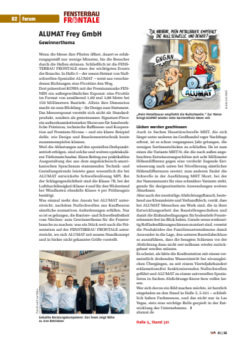 ALUMAT Frey GmbHGewinnerthemaWenn die Messe ihre Pforten %u00f6ffnet, dauert es erfahrungsgem%u00e4%u00df nur wenige Minuten, bis die Besucher durch die Hallen str%u00f6men. Schlie%u00dflich ist die FENSTERBAU FRONTALE eines der wichtigsten Events der Branche. In Halle 5 %u2013 der neuen Heimat von Nullschwellen-Spezialist ALUMAT %u2013 weist aus verschiedenen Richtungen eine Pivott%u00fcre den Weg. Dort pr%u00e4sentiert KOWA mit der Premiummarke FENNEN ein au%u00dfergew%u00f6hnliches Exponat: eine Pivott%u00fcr im Format von ann%u00e4hernd 1,60 mal 3,00 Meter bei 150 Millimetern Bautiefe. Allein ihre Dimension macht sie zum Blickfang %u2013 ihr Design zum Statement.Das Messeexponat versteht sich nicht als Standardprodukt, sondern als gemeinsames Signature-Piece: ein aufmerksamkeitsstarker Showcase f%u00fcr handwerkliche Pr%u00e4zision, technische Raffinesse und Kooperation auf Premium-Niveau %u2013 und ein klares Beispiel daf%u00fcr, wie Design und Bauelementetechnik heute zusammenspielen k%u00f6nnen.Weil die Ablastungen auf den speziellen Drehpunktantrieb erfolgen, sind solche und weitere spektakul%u00e4ren T%u00fcrformate baubar. Einen Beitrag zur praktikablen Ausgestaltung des aus dem angels%u00e4chsisch-amerikanischen Sprachraum stammenden Technik- und Gestaltungstrends leistete ganz wesentlich die bei ALUMAT entwickelte Schwellenl%u00f6sung MPI. Bei der Schlagregendichtheit sind die Klasse 7B, bei der Luftdurchl%u00e4ssigkeit Klasse 4 und f%u00fcr den Widerstand bei Windlasten ebenfalls Klasse 4 per Pr%u00fcfzeugnis best%u00e4tigt. Was einmal mehr den Ansatz bei ALUMAT unterstreicht, nachdem Nullschwellen aus Kaufbeuren s%u00e4mtliche normativen Anforderungen erf%u00fcllen. Nur so ist es gelungen, die Barriere- und Schwellenfreiheit vom Nischen- zum Gewinnerthema f%u00fcr die Fensterbranche zu machen; was ein St%u00fcck weit auch die Pr%u00e4sentation auf der FENSTERBAU FRONTALE unterstreicht, wo sich ALUMAT mit neuem Standkonzept und in bisher nicht gekannter Gr%u00f6%u00dfe vorstellt.L%u00fccken werden geschlossenAuch in Sachen Haust%u00fcrschwelle MHT, die sich l%u00e4ngst unter anderen im Gro%u00dfhandel reger Nachfrage erfreut, ist es schon vergangenes Jahr gelungen, die wenigen Sortimentsl%u00fccken zu schlie%u00dfen. Da ist zum einen die Variante MHT/0, die die nach au%u00dfen angebrachten Entw%u00e4sserungsschlitze mit acht Millimeter H%u00f6hendifferenz gegen eine verdeckt liegende Entw%u00e4sserung nach unten bei Nivellierung s%u00e4mtlicher H%u00f6hendifferenzen ersetzt; zum anderen findet die Schwelle in der Ausf%u00fchrung MHT Short, bei der der Namenszusatz f%u00fcr eine schm%u00e4lere Variante steht, gerade f%u00fcr designorientierte Anwendungen weitere Abnehmer.Aber auch der zweiteilige Abdichtungsflansch, bestehend aus Klemmleiste und Verbundblech, verr%u00e4t, dass bei ALUMAT Menschen am Werk sind, die in ihrer Entwicklungsarbeit das Baustellengeschehen und damit die Einbaubedingungen f%u00fcr bodentiefe Fensterelemente fest im Blick haben. Gerade wenn werksseitig Rollladenf%u00fchrungsschienen montiert sind, versetzt die Produktidee des Familienunternehmens damit Anwender in die Lage, den unteren Bauteilabschluss so auszuf%u00fchren, dass die besagten Schienen vor der Abdichtung dazu nicht erst m%u00fchsam wieder zur%u00fcckgebaut werden m%u00fcssen.Es scheint, als h%u00e4tte die Konfrontation mit einem vermeintlich drohenden Wassereintritt bei niveaugleichen %u00dcberg%u00e4ngen, zu seit einem Vierteljahrhundert reklamationsfrei funktionierenden Nullschwellen gef%u00fchrt und ALUMAT zu einem universellen Spezialisten in Sachen Abdichtungs-Know-how reifen lassen.Wer sich davon ein Bild machen m%u00f6chte, ist herzlich eingeladen an den Stand in Halle 5, 5-321 %u2013 schlie%u00dflich haben Fachmessen, und das nicht nur in Las Vegas, stets eine wichtige Rolle gespielt in der Entwicklung des Unternehmens. %u2759alumat.de Halle 5, Stand 321Grafik: ALUMAT%u201eMein Metallbauer empfiehlt die Nullschwelle.%u201c Zur Messe bringt ALUMAT wieder viele barrierefreie Ideen mitGeballte Beratungskompetenz: Das Team zeigt N%u00e4he zu den BetriebenFoto: Book Your Video82 Forum01|26