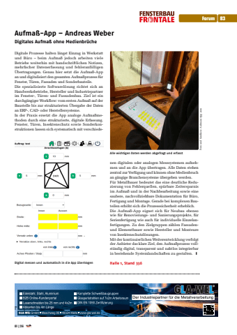 Aufma%u00df-App %u2013 Andreas WeberDigitales Aufma%u00df ohne Medienbr%u00fccheDigitale Prozesse halten l%u00e4ngst Einzug in Werkstatt und B%u00fcro %u2013 beim Aufma%u00df jedoch arbeiten viele Betriebe weiterhin mit handschriftlichen Notizen, mehrfacher Datenerfassung und fehleranf%u00e4lligen %u00dcbertragungen. Genau hier setzt die Aufma%u00df-App an und digitalisiert den gesamten Aufma%u00dfprozess f%u00fcr Fenster, T%u00fcren, Fassaden und Sonderbauteile.Die spezialisierte Softwarel%u00f6sung richtet sich an Handwerksbetriebe, Hersteller und Industriepartner im Fenster-, T%u00fcren- und Fassadenbau. Ziel ist ein durchg%u00e4ngiger Workflo vom ersten Aufma%u00df auf der Baustelle bis zur strukturierten %u00dcbergabe der Daten an ERP-, CAD- oder Herstellersysteme.In der Praxis ersetzt die App analoge Aufma%u00dfmethoden durch eine strukturierte, digitale Erfassung. Fenster, T%u00fcren, Insektenschutz sowie Sonderkonstruktionen lassen sich systematisch mit verschiedenen digitalen oder analogen Messsystemen aufnehmen und an die App %u00fcbertragen. Alle Daten stehen zentral zur Verf%u00fcgung und k%u00f6nnen ohne Medienbruch an g%u00e4ngige Branchensysteme %u00fcbergeben werden.F%u00fcr Metallbauer bedeutet das eine deutliche Reduzierung von Fehlerquellen, sp%u00fcrbare Zeitersparnis im Aufma%u00df und in der Nachbearbeitung sowie eine saubere, nachvollziehbare Dokumentation f%u00fcr B%u00fcro, Fertigung und Montage. Gerade bei komplexen Bauteilen erh%u00f6ht sich die Prozesssicherheit erheblich.Die Aufma%u00df-App eignet sich f%u00fcr Neubau ebenso wie f%u00fcr Renovierungs- und Sanierungsprojekte, f%u00fcr Serienfertigung wie auch f%u00fcr individuelle Einzelanfertigungen. Zu den Zielgruppen z%u00e4hlen Fassadenund Elementbauer sowie Hersteller und Monteure von Insektenschutzl%u00f6sungen.Mit der kontinuierlichen Weiterentwicklung verfolgt der Anbieter das klare Ziel, den Aufma%u00dfprozess vollst%u00e4ndig digital, transparent und nahtlos integrierbar in bestehende Systemlandschaften zu gestalten. %u2759Digital messen und automatisch in die App %u00fcbertragen Halle 1, Stand 336Alle wichtigen Daten werden abgefragt und erfasstFoto und Grafiken: Aufmass-App.comForum 8301 |26