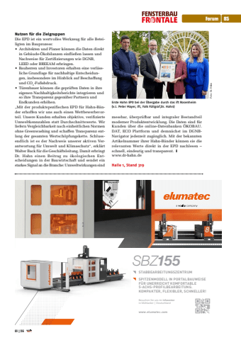 Nutzen f%u00fcr die Zielgruppen Die EPD ist ein wertvolles Werkzeug f%u00fcr alle Beteiligten im Bauprozess: %u2022 Architekten und Planer k%u00f6nnen die Daten direkt in Geb%u00e4ude-%u00d6kobilanzen einflie%u00dfen lassen und Nachweise f%u00fcr Zertifizierungen wie DGNB, LEED oder BREEAM erbringen. %u2022 Bauherren und Investoren erhalten eine verl%u00e4ssliche Grundlage f%u00fcr nachhaltige Entscheidungen, insbesondere im Hinblick auf Beschaffung und CO2-Fu%u00dfabdruck. %u2022 T%u00fcrenbauer k%u00f6nnen die gepr%u00fcften Daten in ihre eigenen Nachhaltigkeitsberichte integrieren und so ihre Transparenz gegen%u00fcber Partnern und Endkunden erh%u00f6hen. %u201eMit der produktspezifischen EPD f%u00fcr Hahn-B%u00e4nder erhoffen wir uns auch einen Wettbewerbsvorteil. Unsere Kunden erhalten objektive, verifizierte Umweltkennzahlen statt Durchschnittswerte. Wir liefern Vergleichbarkeit nach einheitlichen Normen ohne Greenwashing und schaffen Transparenz entlang der gesamten Wertsch%u00f6pfungskette. Schlussendlich ist es der Nachweis unserer aktiven Verantwortung f%u00fcr Umwelt und Klimaschutz%u201c, erkl%u00e4rt Walter Back f%u00fcr die Gesch%u00e4ftsleitung. Damit erbringt Dr. Hahn einen Beitrag zu %u00f6kologischen Entscheidungen in der Bauwirtschaft und sendet ein starkes Signal an die Branche: Umweltwirkungen sind messbar, %u00fcberpr%u00fcfbar und integraler Bestandteil moderner Produktentwicklung. Die Daten sind f%u00fcr Kunden %u00fcber die online-Datenbanken %u00d6KOBAU.DAT, ECO Plattform und demn%u00e4chst im DGNBNavigator jederzeit zug%u00e4nglich. Mit der bekannten Artikelnummer ihrer Hahn-B%u00e4nder k%u00f6nnen sie die relevanten Werte direkt in der EPD nachlesen %u2013 schnell, eindeutig und transparent. %u2759www.dr-hahn.deHalle 1, Stand 319SPITZENMODELL IN PORTALBAUWEISEF%u00dcR UNERREICHT KOMFORTABLE 5-ACHS-PROFILBEARBEITUNG.KOMPAKTER, FLEXIBLER, SCHNELLER!STABBEARBEITUNGSZENTRUMSBZ155www.elumatec.comBesuchen Sie uns im infocenterin M%u00fchlacker | DeutschlandErste Hahn EPD bei der %u00dcbergabe durch das ift Rosenheim (v.l. Peter Mayer, ift, Falk F%u00fcllgraf,Dr. Hahn)Foto: Dr. Hahn Forum 8501 |26