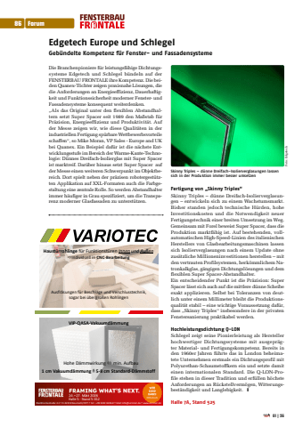 Edgetech Europe und Schlegel Geb%u00fcndelte Kompetenz f%u00fcr Fenster- und FassadensystemeDie Branchenpioniere f%u00fcr leistungsf%u00e4hige Dichtungssysteme Edgetech und Schlegel b%u00fcndeln auf der FENSTERBAU FRONTALE ihre Kompetenz. Die beiden Quanex-T%u00f6chter zeigen praxisnahe L%u00f6sungen, die die Anforderungen an Energieeffizienz, Dauerhaftigkeit und Funktionssicherheit moderner Fenster- und Fassadensysteme konsequent weiterdenken.%u201eAls das Original unter den flexiblen Abstandhaltern setzt Super Spacer seit 1989 den Ma%u00dfstab f%u00fcr Pr%u00e4zision, Energieeffizienz und Produktivit%u00e4t. Auf der Messe zeigen wir, wie diese Qualit%u00e4ten in der industriellen Fertigung sp%u00fcrbare Wettbewerbsvorteile schaffen%u201c, so Mike Moran, VP Sales - Europe and UK bei Quanex. Ein Beispiel daf%u00fcr ist die n%u00e4chste Entwicklungsstufe im Bereich der Warme-Kante-Technologie: D%u00fcnnes Dreifach-Isolierglas mit Super Spacer ist marktreif. Dar%u00fcber hinaus setzt Super Spacer auf der Messe einen weiteren Schwerpunkt im Objektbereich. Dort spielt neben der pr%u00e4zisen robotergest%u00fctzten Applikation auf XXL-Formaten auch die Farbgestaltung eine zentrale Rolle. So werden Abstandhalter immer h%u00e4ufiger in Grau spezifiziert, um die Transparenz moderner Glasfassaden zu unterst%u00fctzen.Fertigung von %u201eSkinny Triples%u201cSkinny Triples %u2013 d%u00fcnne Dreifach-Isolierverglasungen %u2013 entwickeln sich zu einem Wachstumsmarkt. Bisher standen jedoch technische H%u00fcrden, hohe Investitionskosten und die Notwendigkeit neuer Fertigungstechnik einer breiten Umsetzung im Weg. Gemeinsam mit Forel beweist Super Spacer, dass die Produktion marktf%u00e4hig ist. Auf bestehenden, vollautomatischen High-Speed-Linien des italienischen Herstellers von Glasbearbeitungsmaschinen lassen sich Isolierverglasungen nach einem Update ohne zus%u00e4tzliche Millioneninvestitionen herstellen %u2013 mit den vertrauten Profilsystemen, herk%u00f6mmlichem Natronkalkglas, g%u00e4ngigen Dichtungsl%u00f6sungen und dem flexiblen Super Spacer-Abstandhalter.Ein entscheidender Punkt ist die Pr%u00e4zision: Super Spacer l%u00e4sst sich auch auf die mittlere d%u00fcnne Scheibe exakt applizieren. Selbst bei Toleranzen von deutlich unter einem Millimeter bleibt die Produktionsqualit%u00e4t stabil %u2013 eine wichtige Voraussetzung daf%u00fcr, dass %u201eSkinny Triples%u201c insbesondere in der privaten Fenstersanierung praktikabel werden.Hochleistungsdichtung Q-LON Schlegel zeigt seine Pionierleistung als Hersteller hochwertiger Dichtungssysteme mit ausgepr%u00e4gter Material- und Fertigungskompetenz. Bereits in den 1960er Jahren f%u00fchrte das in London beheimatete Unternehmen erstmals ein Dichtungsprofil mit Polyurethan-Schaumstoffkern ein und setzte damit einen internationalen Standard. Die Q-LON-Profile stehen in dieser Tradition und erf%u00fcllen h%u00f6chste Anforderungen an R%u00fcckstellverm%u00f6gen, Witterungsbest%u00e4ndigkeit und Langlebigkeit. %u2759Halle 7A, Stand 525 Skinny Triples %u2013 d%u00fcnne Dreifach-Isolierverglasungen lassen sich in der Produktion immer besser umsetzenHalle 5 - Stand 5-352 Wei%u00dfmarterstra%u00dfe 3-5 %u0178 D-92318 Neumarkt/OPf. %u0178 Tel.: +49 9181 6946-0 %u0178 Mail: info@variotec.de %u0178 www.variotec.de1 cm Vakuumd%u00e4mmung = 5-8 cm Standard-D%u00e4mmstoffHohe D%u00e4mmwirkung %u00f3 min. AufbauHaust%u00fcrrohlinge f%u00fcr Funktionst%u00fcren Innen und Au%u00dfen%u00f0Individuell in CNC-BearbeitungAusfr%u00e4sungen f%u00fcr Beschl%u00e4ge und Verschlusstechnik,sogar bei %u00fcbergro%u00dfen RohlingenVIP-QASA-Vakuumd%u00e4mmungFoto: Edgetech86 Forum01|26