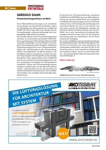 GARGIULO GmbHVorwandmontagerahmen ab WerkNeue Werkstoff-Formulierungen und zus%u00e4tzliche Anwendungen f%u00fcr bestehende Materialien stehen im Mittelpunkt des Messeauftritts der GARGIULO GmbH. Der Fokus liegt dabei auf L%u00f6sungen f%u00fcr die Vorwandmontage, verbesserte Isolierstege sowie leistungsf%u00e4hige D%u00e4mmstoffe f%u00fcr Glasfalze.Ein zentrales Thema ist das Vorwandmontagesystem auf Basis des Konstruktionswerkstoffs INSUFOX. Das aus gesch%u00e4umtem PET gefertigte Material erf%u00fcllt mit gro%u00dfen Lieferl%u00e4ngen von sechs Metern und mehr, guter Schwei%u00dfeignung, hoher Festigkeit, belastbaren Schraubenauszugswerten sowie Temperaturbest%u00e4ndigkeit alle Anforderungen an die Gebrauchstauglichkeit. Die M%u00f6glichkeit, die Bl%u00f6cke flexibel in der ben%u00f6tigten L%u00e4nge zu produzieren, erlaubt eine pr%u00e4zise Anpassung des Unterbauprofils an das jeweilige Bauelement. Diese Eigenschaften nutzt GARGIULO nun f%u00fcr ein modernes Vorwandmontagesystem, das eine werkseitige Vorfertigung der Montagerahmen erm%u00f6glicht. Fenster und Vorwandmontage k%u00f6nnen passgenau konfektioniert auf die Baustelle geliefert werden %u2013 ohne Zuschnitt vor Ort. Das spart Zeit und reduziert Verschnitt sowie Ressourcen, wie der %u00f6ffentlich bestellte und vereidigte Sachverst%u00e4ndige Marc Sch%u00fctt betont.Im Bereich der Polyamid-Isolierstege pr%u00e4sentiert GARGIULO mit INSUREX eine neue Materialformulierung. Sie erreicht Lambda-Werte, die im Vergleich zu bisherigen PA-Steg-L%u00f6sungen um bis zu 30 Prozent verbessert sind. Gleichzeitig sinkt das Raumgewicht um rund ein Drittel von etwa 1,3 auf 1,0 g/cm%u00b3, was sich positiv auf den CO2-Fu%u00dfabdruck auswirkt. Die reduzierte Dichte beeinflusst jedoch auch die Stabilit%u00e4t, die je nach Anwendung im konkreten Bauvorhaben bewertet werden muss. F%u00fcr die fachliche Einordnung steht das Unternehmen auf der Messe beratend zur Verf%u00fcgung.Ein weiteres Highlight sind neue Isolationssch%u00e4ume f%u00fcr Glasfalzd%u00e4mmungen. Mit INSUNOX erg%u00e4nzt GARGIULO sein Sortiment um einen PE-Schaum mit verbessertem Lambda-Wert von 0,035 W/m%u00b2K. In der Praxis kann dies zu einer kumulierten Verbesserung des Fassaden-U-Werts von bis zu acht Prozent f%u00fchren %u2013 ein entscheidender Faktor bei anspruchsvollen Ausschreibungen. %u2759Halle 6, Stand 453NEUDie neue innovative L%u00dcFTUNGSKLAPPEverbindet klare Fassadenoptik mit effi zienter Luftf%u00fchrung, hoher Dichtigkeit und optimalem Komfort.WWW.AKOTHERM.DEDIE L%u00dcFTUNGSL%u00d6SUNG F%u00dcR ARCHITEKTURMIT SYSTEMINSUREX basiert auf einer neuen MaterialformulierungFoto: GARGIULO GmbH88 Forum01|26