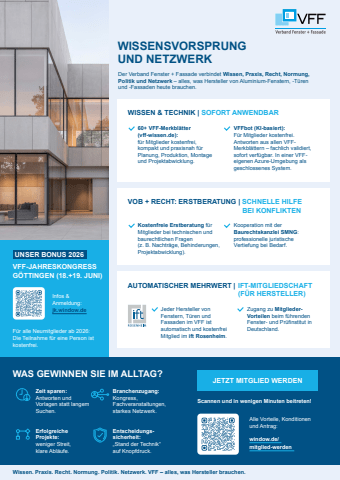 WISSENSVORSPRUNG UND NETZWERKDer Verband Fenster + Fassade verbindet Wissen, Praxis, Recht, Normung, Politik und Netzwerk %u2013 alles, was Hersteller von Aluminium-Fenstern, -T%u00fcren und -Fassaden heute brauchen.WISSEN & TECHNIK | SOFORT ANWENDBAR60+ VFF-Merkbl%u00e4tter (vff-wissen.de): f%u00fcr Mitglieder kostenfrei, kompakt und praxisnah f%u00fcr Planung, Produktion, Montage und Projektabwicklung.VFFbot (KI-basiert):F%u00fcr Mitglieder kostenfrei. Antworten aus allen VFFMerkbl%u00e4ttern %u2013 fachlich validiert, sofort verf%u00fcgbar. In einer VFFeigenen Azure-Umgebung als geschlossenes System.VOB + RECHT: ERSTBERATUNG | SCHNELLE HILFEKostenfreie Erstberatung f%u00fcr Mitglieder bei technischen und baurechtlichen Fragen (z. B. Nachtr%u00e4ge, Behinderungen, Projektabwicklung).Kooperation mit der Baurechtskanzlei SMNG: professionelle juristische Vertiefung bei Bedarf.BEI KONFLIKTENJETZT MITGLIED WERDENScannen und in wenigen Minuten beitreten!Alle Vorteile, Konditionen und Antrag:WAS GEWINNEN SIE IM ALLTAG?Zeit sparen: Antworten und Vorlagen statt langem Suchen.Branchenzugang: Kongress, Fachveranstaltungen, starkes Netzwerk.Erfolgreiche Projekte: weniger Streit, klare Abl%u00e4ufe.Entscheidungssicherheit: %u201eStand der Technik%u201c auf Knopfdruck.window.de/mitglied-werdenWissen. Praxis. Recht. Normung. Politik. Netzwerk. VFF %u2013 alles, was Hersteller brauchen.UNSER BONUS 2026VFF-JAHRESKONGRESS G%u00d6TTINGEN (18.+19. JUNI) F%u00fcr alle Neumitglieder ab 2026: Die Teilnahme f%u00fcr eine Person ist kostenfrei.Infos & Anmeldung: jk.window.deAUTOMATISCHER MEHRWERT | IFT-MITGLIEDSCHAFT (F%u00dcR HERSTELLER)Jeder Hersteller von Fenstern, T%u00fcren und Fassaden im VFF ist automatisch und kostenfrei Mitglied im ift Rosenheim.Zugang zu MitgliederVorteilen beim f%u00fchrenden Fenster- und Pr%u00fcfinstitut in Deutschland.WISSENSVORSPRUNG UND NETZWERKDer Verband Fenster + Fassade verbindet Wissen, Praxis, Recht, Normung, Politik und Netzwerk %u2013 alles, was Hersteller von Aluminium-Fenstern, -T%u00fcren und -Fassaden heute brauchen.WISSEN & TECHNIK | SOFORT ANWENDBAR60+ VFF-Merkbl%u00e4tter (vff-wissen.de): f%u00fcr Mitglieder kostenfrei, kompakt und praxisnah f%u00fcr Planung, Produktion, Montage und Projektabwicklung.VFFbot (KI-basiert):F%u00fcr Mitglieder kostenfrei. Antworten aus allen VFFMerkbl%u00e4ttern %u2013 fachlich validiert, sofort verf%u00fcgbar. In einer VFFeigenen Azure-Umgebung als geschlossenes System.VOB + RECHT: ERSTBERATUNG | SCHNELLE HILFEKostenfreie Erstberatung f%u00fcr Mitglieder bei technischen und baurechtlichen Fragen (z. B. Nachtr%u00e4ge, Behinderungen, Projektabwicklung).Kooperation mit der Baurechtskanzlei SMNG: professionelle juristische Vertiefung bei Bedarf.BEI KONFLIKTENJETZT MITGLIED WERDENScannen und in wenigen Minuten beitreten!Alle Vorteile, Konditionen und Antrag:WAS GEWINNEN SIE IM ALLTAG?Zeit sparen: Antworten und Vorlagen statt langem Suchen.Branchenzugang: Kongress, Fachveranstaltungen, starkes Netzwerk.Erfolgreiche Projekte: weniger Streit, klare Abl%u00e4ufe.Entscheidungssicherheit: %u201eStand der Technik%u201c auf Knopfdruck.window.de/mitglied-werdenWissen. Praxis. Recht. Normung. Politik. Netzwerk. VFF %u2013 alles, was Hersteller brauchen.UNSER BONUS 2026VFF-JAHRESKONGRESS G%u00d6TTINGEN (18.+19. JUNI) F%u00fcr alle Neumitglieder ab 2026: Die Teilnahme f%u00fcr eine Person ist kostenfrei.Infos & Anmeldung: jk.window.deAUTOMATISCHER MEHRWERT | IFT-MITGLIEDSCHAFT (F%u00dcR HERSTELLER)Jeder Hersteller von Fenstern, T%u00fcren und Fassaden im VFF ist automatisch und kostenfrei Mitglied im ift Rosenheim.Zugang zu MitgliederVorteilen beim f%u00fchrenden Fenster- und Pr%u00fcfinstitut in Deutschland.WISSENSVORSPRUNG UND NETZWERKDer Verband Fenster + Fassade verbindet Wissen, Praxis, Recht, Normung, Politik und Netzwerk %u2013 alles, was Hersteller von Aluminium-Fenstern, -T%u00fcren und -Fassaden heute brauchen.WISSEN & TECHNIK | SOFORT ANWENDBAR60+ VFF-Merkbl%u00e4tter (vff-wissen.de): f%u00fcr Mitglieder kostenfrei, kompakt und praxisnah f%u00fcr Planung, Produktion, Montage und Projektabwicklung.VFFbot (KI-basiert):F%u00fcr Mitglieder kostenfrei. Antworten aus allen VFFMerkbl%u00e4ttern %u2013 fachlich validiert, sofort verf%u00fcgbar. In einer VFFeigenen Azure-Umgebung als geschlossenes System.VOB + RECHT: ERSTBERATUNG | SCHNELLE HILFEKostenfreie Erstberatung f%u00fcr Mitglieder bei technischen und baurechtlichen Fragen (z. B. Nachtr%u00e4ge, Behinderungen, Projektabwicklung).Kooperation mit der Baurechtskanzlei SMNG: professionelle juristische Vertiefung bei Bedarf.BEI KONFLIKTENJETZT MITGLIED WERDENScannen und in wenigen Minuten beitreten!Alle Vorteile, Konditionen und Antrag:WAS GEWINNEN SIE IM ALLTAG?Zeit sparen: Antworten und Vorlagen statt langem Suchen.Branchenzugang: Kongress, Fachveranstaltungen, starkes Netzwerk.Erfolgreiche Projekte: weniger Streit, klare Abl%u00e4ufe.Entscheidungssicherheit: %u201eStand der Technik%u201c auf Knopfdruck.window.de/mitglied-werdenWissen. Praxis. Recht. Normung. Politik. Netzwerk. VFF %u2013 alles, was Hersteller brauchen.UNSER BONUS 2026VFF-JAHRESKONGRESS G%u00d6TTINGEN (18.+19. JUNI) F%u00fcr alle Neumitglieder ab 2026: Die Teilnahme f%u00fcr eine Person ist kostenfrei.Infos & Anmeldung: jk.window.deAUTOMATISCHER MEHRWERT | IFT-MITGLIEDSCHAFT (F%u00dcR HERSTELLER)Jeder Hersteller von Fenstern, T%u00fcren und Fassaden im VFF ist automatisch und kostenfrei Mitglied im ift Rosenheim.Zugang zu MitgliederVorteilen beim f%u00fchrenden Fenster- und Pr%u00fcfinstitut in Deutschland.