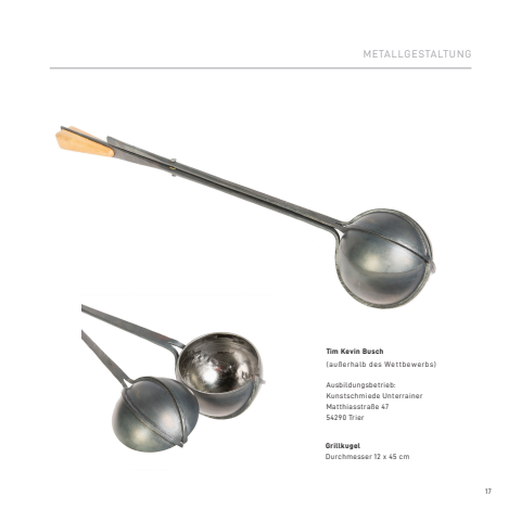 17Tim Kevin Busch(au%u00dferhalb des Wettbewerbs)Ausbildungsbetrieb:Kunstschmiede UnterrainerMatthiasstra%u00dfe 4754290 TrierGrillkugelDurchmesser 12 x 45 cmMETALLGESTALTUNG