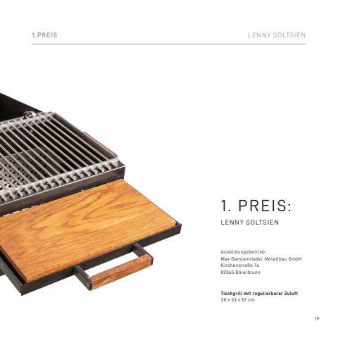 19Ausbildungsbetrieb:Max Gampenrieder Metallbau GmbH Kirchenstra%u00dfe 7a 82065 BaierbrunnTischgrill mit regulierbarer Zuluft38 x 53 x 57 cm1. PREIS: LENNY SOLTSIEN1.PREIS LENNY SOLTSIEN