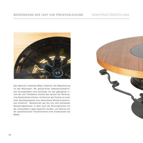 20BEGR%u00dcNDUNG DER JURY ZUR PREISVERLEIHUNG KONSTRUKTIONSTECHNIKDas dekorativ wirkende M%u00f6bel zelebriert die Begeisterung f%u00fcr den Motorsport. Mit spielerischer Selbstverst%u00e4ndlichkeit korrespondiert eine Autofelge mit den gebogenen Linien der drei Tischbeine, welche den Verlauf der N%u00fcrburgring-Nordschleife zitieren. Im Zentrum des Tisches ist unter einer Rauchglasplatte eine beleuchtete Miniaturrennstrecke installiert.%u00a0 Beeindruckt war die Jury vom komplexen Gestaltungsprozess, in dem auch die Nutzungsrechte f%u00fcr die verwendeten Logos beachtet wurden, und ebenso von der gestalterischen Transformation einer Erlebniswelt als M%u00f6bel.