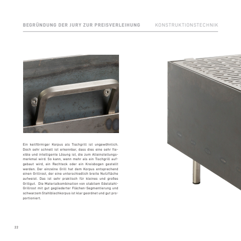 22BEGR%u00dcNDUNG DER JURY ZUR PREISVERLEIHUNG KONSTRUKTIONSTECHNIKEin keilf%u00f6rmiger Korpus als Tischgrill ist ungew%u00f6hnlich. Doch sehr schnell ist erkennbar, dass dies eine sehr flexible und intelligente L%u00f6sung ist, die zum Alleinstellungsmerkmal wird. So kann, wenn mehr als ein Tischgrill aufgebaut wird, ein Rechteck oder ein Kreisbogen gestellt werden. Der einzelne Grill hat dem Korpus entsprechend einen Grillrost, der eine unterschiedlich breite Nutzfl%u00e4che aufweist. Das ist sehr praktisch f%u00fcr kleines und gro%u00dfes Grillgut.%u00a0 Die Materialkombination von stabilem EdelstahlGrillrost mit gut gegliederter Fl%u00e4chen-Segmentierung und schwarzem Stahlblechkorpus ist klar geordnet und gut proportioniert.