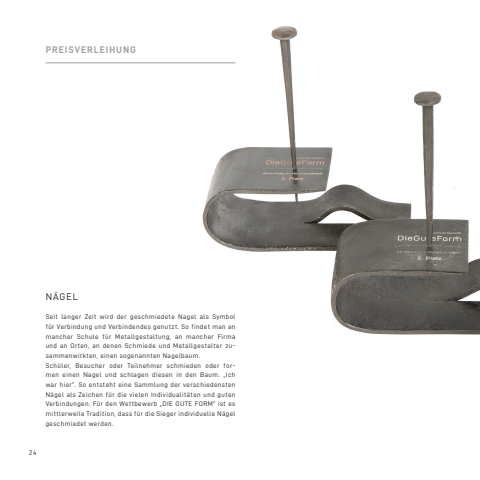 24PREISVERLEIHUNG N%u00c4GELSeit langer Zeit wird der geschmiedete Nagel als Symbol f%u00fcr Verbindung und Verbindendes genutzt. So findet man an mancher Schule f%u00fcr Metallgestaltung, an mancher Firma und an Orten, an denen Schmiede und Metallgestalter zusammenwirkten, einen sogenannten Nagelbaum. Sch%u00fcler, Besucher oder Teilnehmer schmieden oder formen einen Nagel und schlagen diesen in den Baum. %u201eIch war hier%u201c. So entsteht eine Sammlung der verschiedensten N%u00e4gel als Zeichen f%u00fcr die vielen Individualit%u00e4ten und guten Verbindungen. F%u00fcr den Wettbewerb %u201eDIE GUTE FORM%u201c ist es mittlerweile Tradition, dass f%u00fcr die Sieger individuelle N%u00e4gel geschmiedet werden.