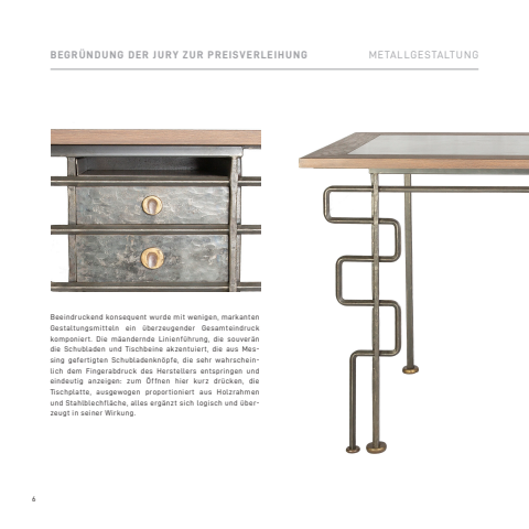 6BEGR%u00dcNDUNG DER JURY ZUR PREISVERLEIHUNG METALLGESTALTUNGBeeindruckend konsequent wurde mit wenigen, markanten Gestaltungsmitteln ein %u00fcberzeugender Gesamteindruck komponiert. Die m%u00e4andernde Linienf%u00fchrung, die souver%u00e4n die Schubladen und Tischbeine akzentuiert, die aus Messing gefertigten Schubladenkn%u00f6pfe, die sehr wahrscheinlich dem Fingerabdruck des Herstellers entspringen und eindeutig anzeigen: zum %u00d6ffnen hier kurz dr%u00fccken, die Tischplatte, ausgewogen proportioniert aus Holzrahmen und Stahlblechfl%u00e4che, alles erg%u00e4nzt sich logisch und %u00fcberzeugt in seiner Wirkung.