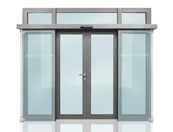 Die Automatik-Schiebetür wird vor die Feuer-Rauchschutztür montiert, die über eine Fest-stellanlage auf 180° offengehalten wird. Die Rahmenprofile dieser Tür sind in dieser Stellung in der gleichen Flucht wie die der Seitenteile angeordnet, sodass sich eine harmonische, nahezu parallele Profilansicht ergibt.