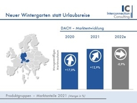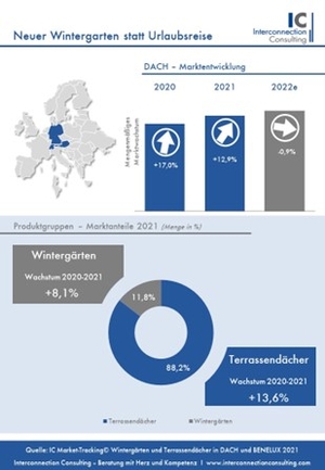 Der Höhepunkt am Markt für Wintergärten und Terrassendächer ist 2022 bereits überschritten. Denn dieser wird in diesem Jahr bereits um 0,9% in Menge schrumpfen. Im regionalen Vergleich zeigte die Schweiz eine schwächere Entwicklung als Deutschland und Österreich. Das Wachstum des Marktes betrug in der Schweiz im letzten Jahr 7% verglichen mit zweistelligen Wachstumszahlen in Österreich und Deutschland. „Dies hat damit zu tun, dass Einfamilienhäuser in der Schweiz oft große Wohnräume und Fensterflächen haben und somit einerseits keine zusätzlichen Wintergärten und Dächer nötig sind“, erklärt Johannes Lözelt, Autor der Studie. Insgesamt lag das Absatzvolumen bei 76.795 Einheiten und der Gesamtumsatz bei 301,3 Mio. Euro. Gerade in der COVID-Zeit als die Menschen nicht auf Urlaub fuhren, investierten sie in den Ausbau ihrer privaten Häuser. Seit Mitte des Jahres 2022 kühlt der Markt jedoch zusehends ab. In den nächsten Jahren wird die Stagflation (Stagnation und Inflation) einerseits die Nachfrage nach Wintergärten und Terrassendächer senken, andererseits die Preise um durchschnittlich 5% jährlich ansteigen lassen.
