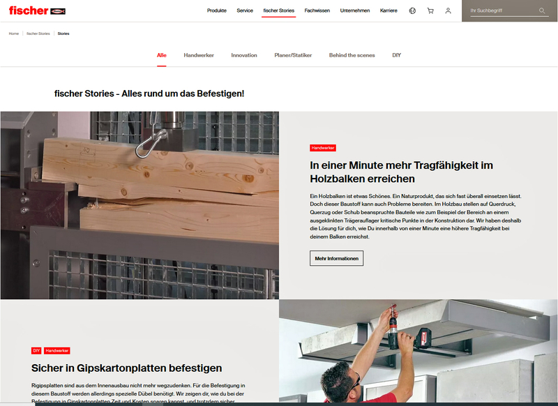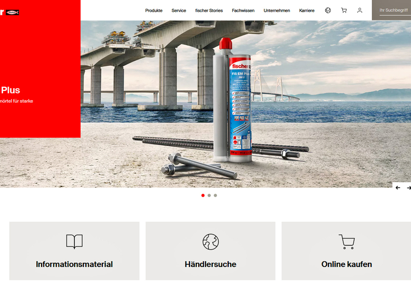 Fassadenbauer, Statiker, Bauingenieure und Planer können sich über den aktuellen Stand zu fischer Produkten informieren und nach Vorschriften suchen. Anwender finden ausführliche Reportagen zu Referenzprojekten weltweit. Ein neuer Navigationspunkt ist das „Fachwissen“, wo Besucher auf verschiedene Anwendungen und Gewerke abgestimmte fischer Sortimente finden. Die Website ist mit dem myfischer Partnerportal verknüpft. Auch der YouTube Kanal von fischer DIEFESTMACHER ist mit einem Klick erreichbar. Zugriff auf meistgenutzte Funktionen und Inhalte haben Besucher direkt von der Startseite aus. Dazu gehören Downloadmaterial, die fischer FiXperience Bemessungssoftware, die Technische Beratung, das Online- und Präsenz-Schulungsprogramm der fischer Akademie oder auch die Innovationen und Highlights aus dem fischer Produktspektrum.