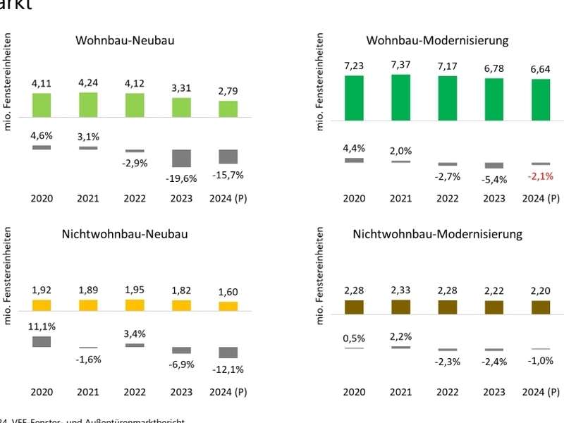 Die gegenwärtigen Daten zeigen im Wohnungsbau, dass die Sanierung 2023 um 5,4 Prozent zurückgeht und 2024 um weitere 2,1 Prozent nachgibt auf dann 6,64 Mio. FE. Trotz eines nach wie vor hohen Überhangs an Baugenehmigungen für Wohnneubauten sind die Neugenehmigungen 2023 um 28 Prozent und aktuell im laufenden Jahr bereits ebenfalls im Januar um weitere 28 Prozent zurückgegangen. Für den Neubau im Fenstermarkt beträgt der Rückgang 2023 dramatische insgesamt 15,5 Prozent, obwohl noch unfertige Projekte im Jahr 2023 umgesetzt wurden. 2024 wird der Fensterabsatz im Neubau voraussichtlich nochmals aber stark um 14,4 Prozent zurückgehen auf dann nur noch 4,39 Mio. FE.