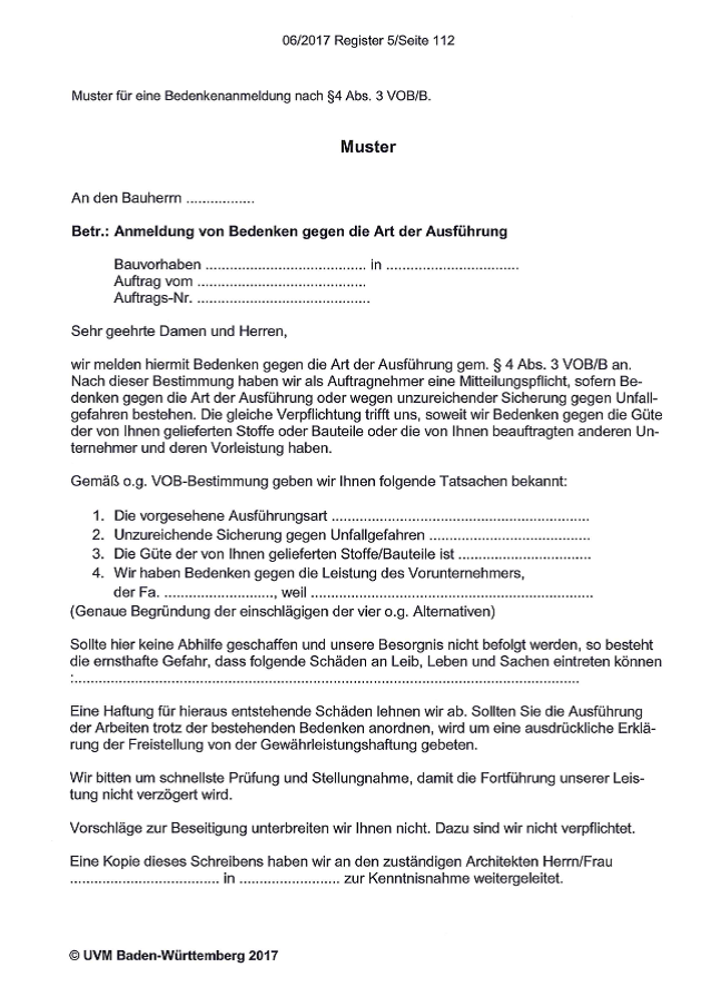 Formblatt Anmeldung von Bedenken gegen die Art der Ausführung
